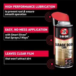 Details: Love your smooth, quiet garage doors! Make sure they not only look nice from the outside, but also work effortlessly on the inside. Protect your investment in high quality garage doors with high-quality, premium 3-IN-ONE Garage Door Lubricant. Prevent rusting, corrosion, squeaking, jamming, and friction with just a few sprays of 3-IN-ONE. Keep your garage door parts lubricated without leaving a residue that attracts dirt and creates friction over time. The intelligent straw allows both precision streams or fan shaped sprays and can never be lost or misplaced.