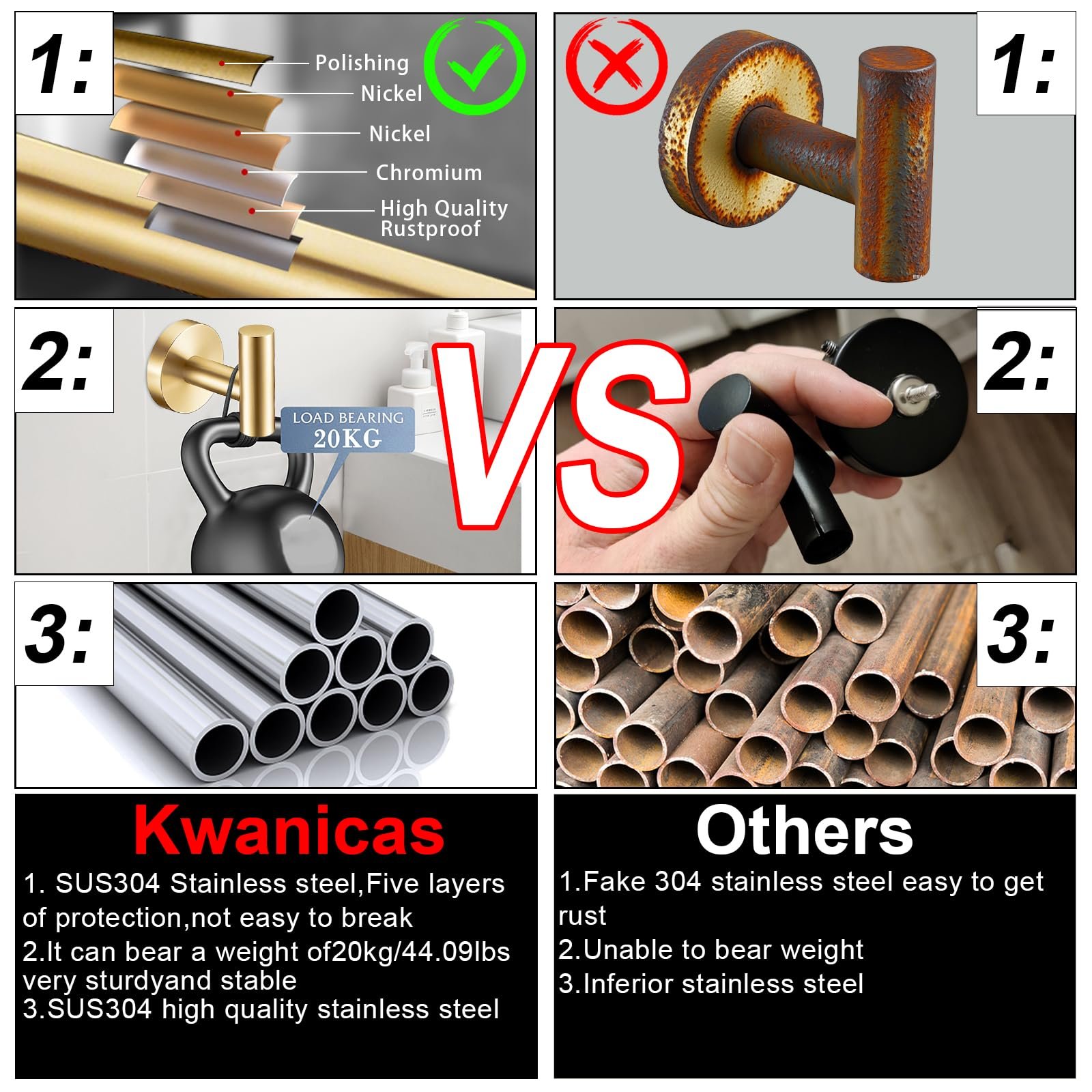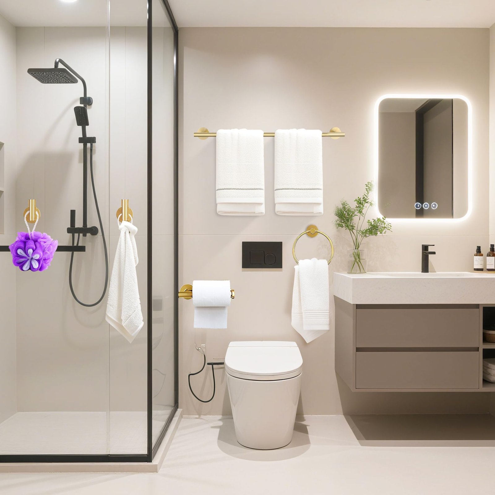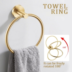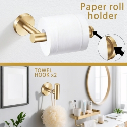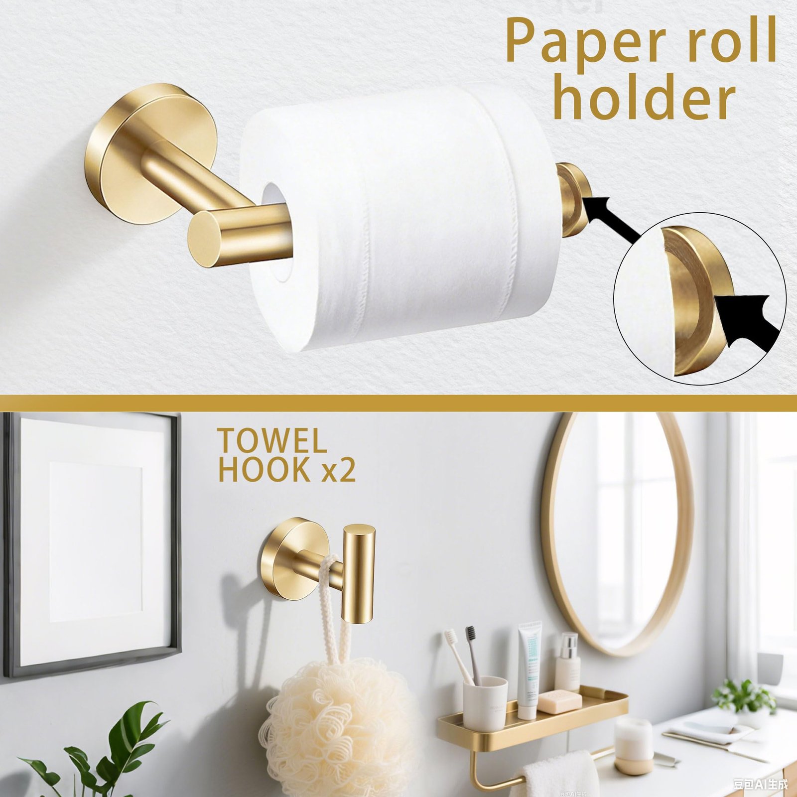 - [Excellent anti-rust performance]: The Brushed Gold Bathroom Hardware Set is made of SUS304 type high-quality stainless steel, with 18/10 chromium/nickel content added, which has excellent strength and durability. 4 protection layers are added on SUS304 stainless steel to make it more sturdy and more anti-rust. Guaranteed not to peel or chip, the bathroom cubicle towel rods always gives you a new look.