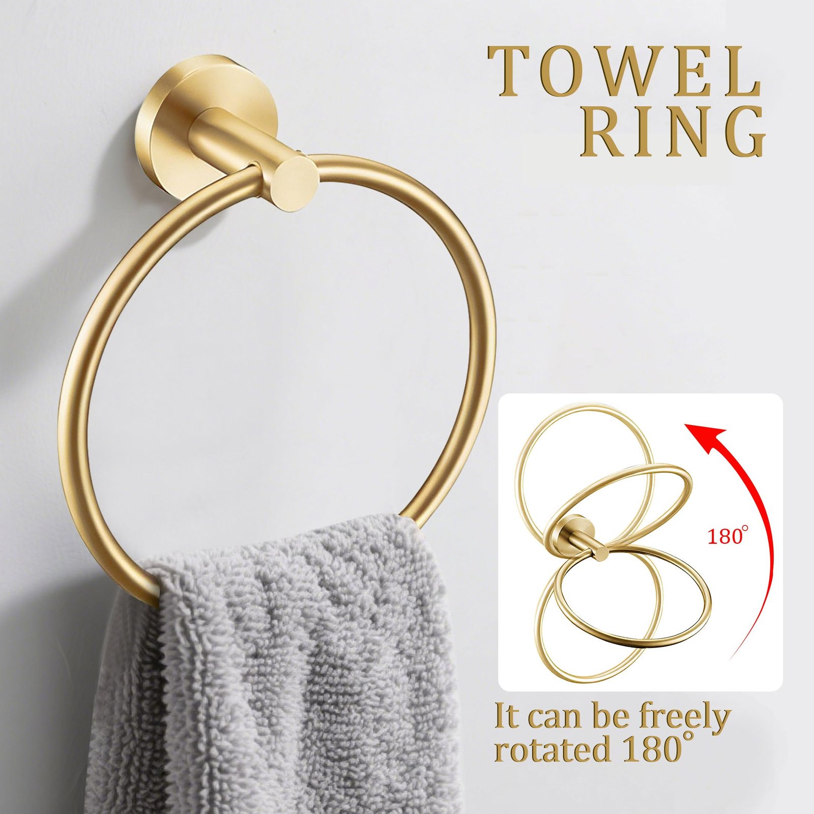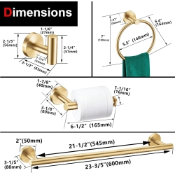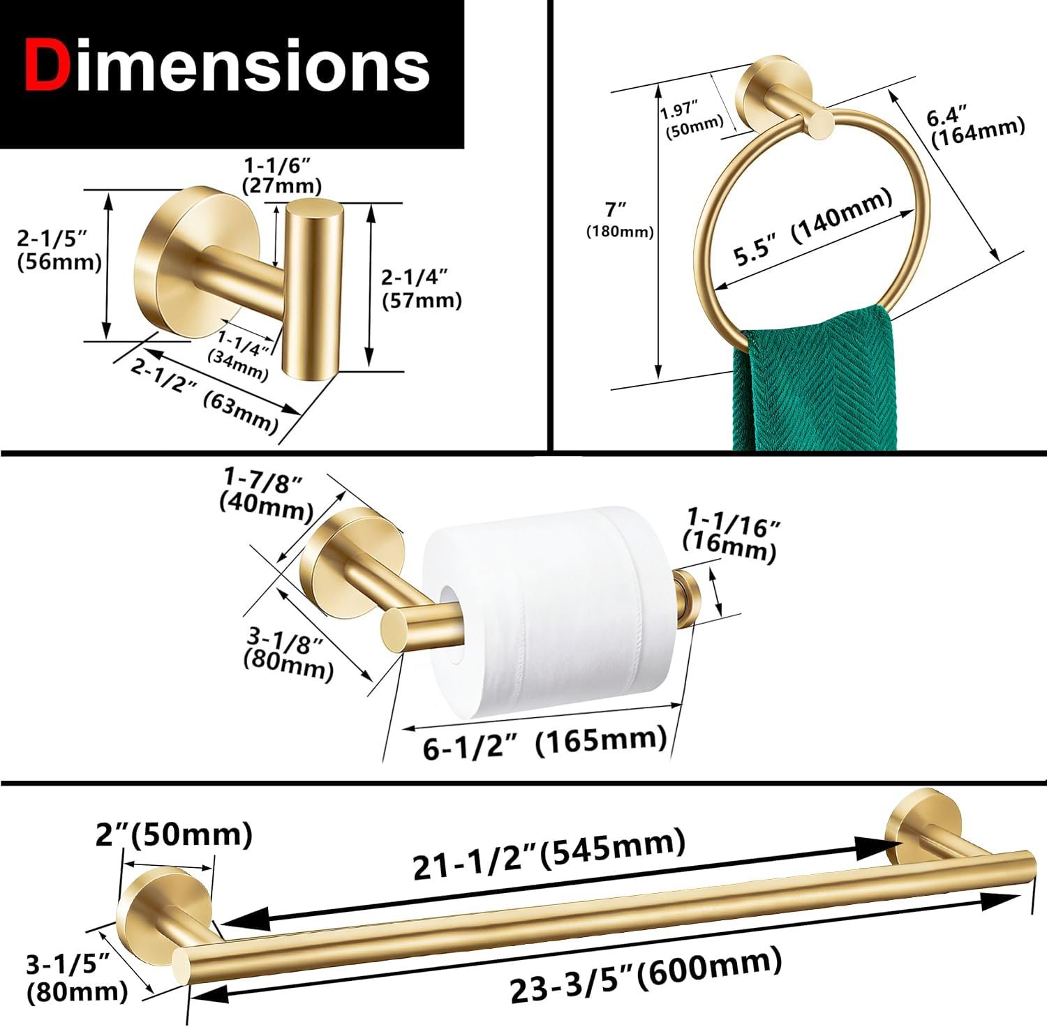 - [Size reference]: Brushed gold towel bar: 23″(L) x 3.15″W) x 1.96″(D) inches, Brushed gold hand towel ring: 6.45 inches (length) x 1.96 inches (width) x 7 inches (D) inches, Brushed gold toilet paper holder: 6.5 inches (length) x 3.15 inches (width) x 1.57 inches (D) inches, Brushed gold towel hook: 2.2 inches (L) x 2.48 inches (W) x 2.47 inches (D) inches.