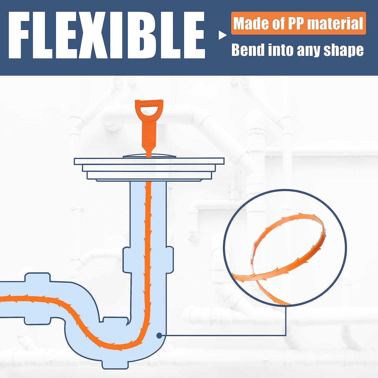 - 【EXCELLENT LENGTH & FLEXIBLE】Drain snake is 25 inches long with tiny hooked teeth on it. The product is made by PP material which is highly flexible. Its flexibility allows it to remove deeper hair and blockage in the curved pipe.