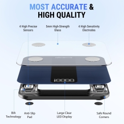 - 【17 Body data analysis】 This bathroom scales advanced BIA technology analyses Weight, Heart Rate, BMR, BMI, Fat Ratio, Fat Mass, Muscle Rate and more 17 basic metrics, with 3 body health assessments and tailored guidance for Fat/Muscle balance. Sync seamlessly to your app for holistic health tracking