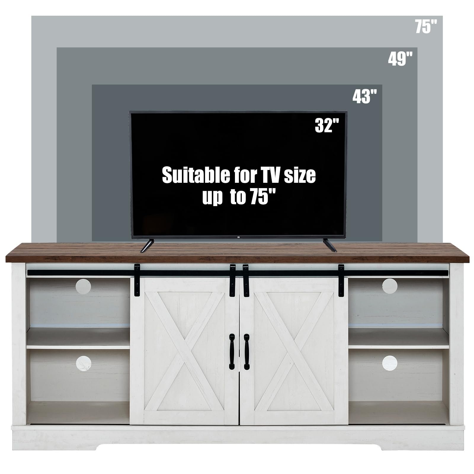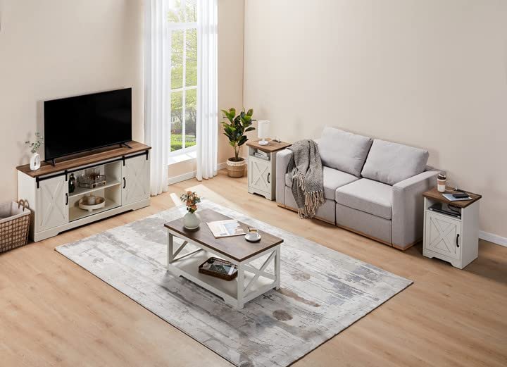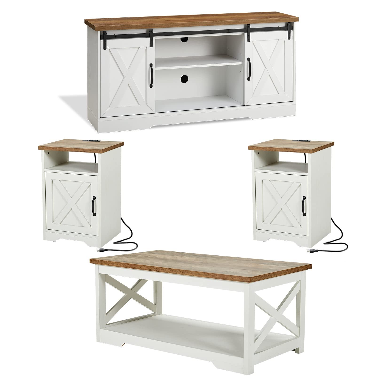 - Features a Sliding Barn door TV stand, coffee table & 2 end tables are all made from MDF, particle board, and finished in a stylish Distress white.