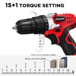 - 15+1 Torque Settings for Delicate Work – 15+1 torque (280 In-lbs) settings and variable speed (0-550 RPM) provide precise control for driving in/out screws to prevent stripping, and drilling into wood, drywall, plastics, and even metal with ease. Max torque for drilling into wood 13/16-Inch or steel plate 3/8-Inch. Note: this drill is Not suitable for more than 25mm drill bits and Not for Concrete/Masonry Walls
