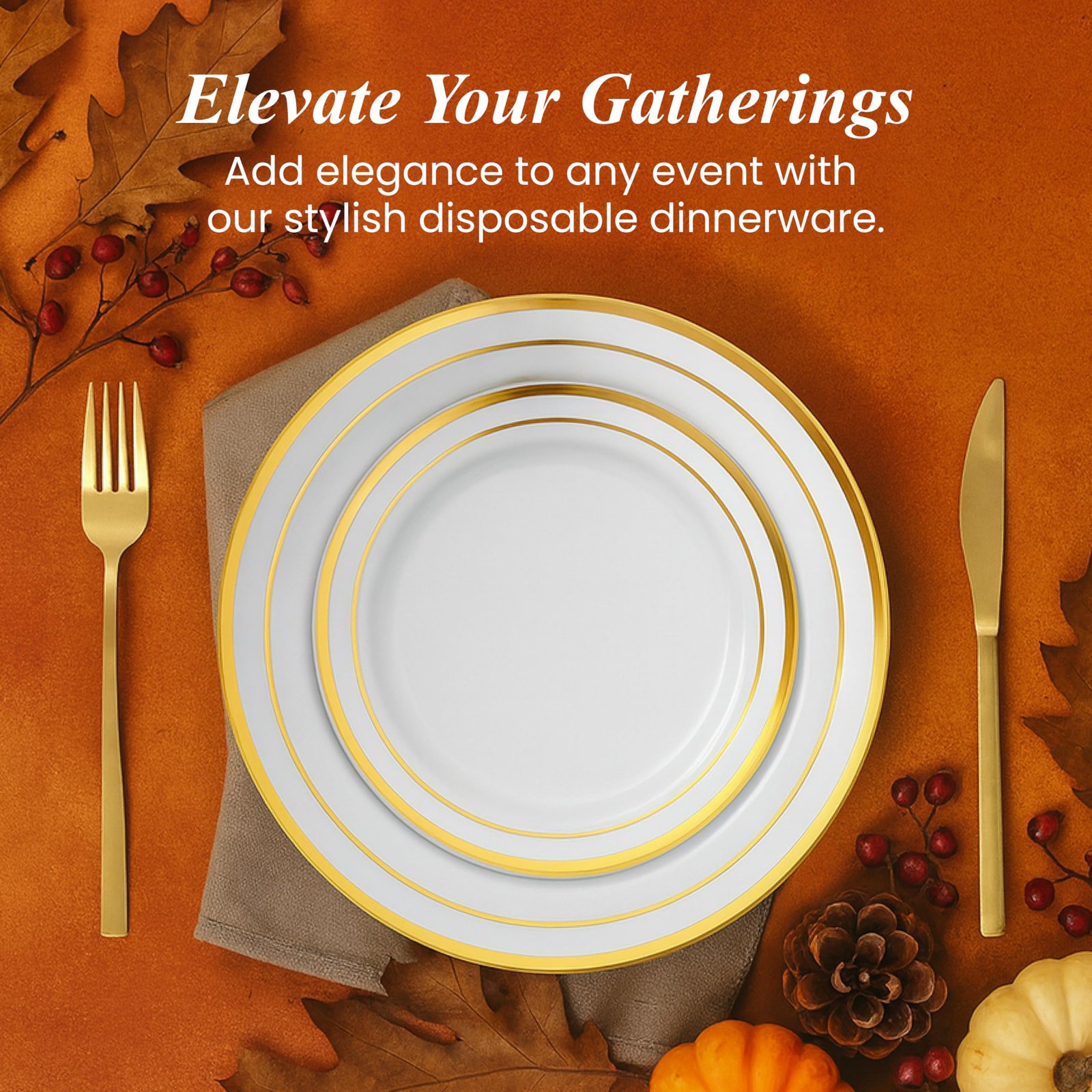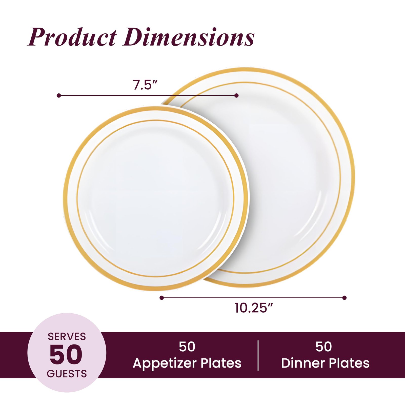 Aya’s Cutlery Kingdom 100 White and Gold Plastic Plates for Thanksgiving Dinner – Fancy Plate for Party – 50 (10″) Dinner and 50 (7.5″) Salad Plates – Heavy Duty, Elegant Disposable Tableware Set