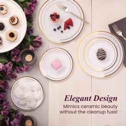 • Elegant Gold and White Design: These gold and white plastic plates feature a refined gold trim that mimics fine China, perfect for weddings, dinners, or plates for Christmas with gold trim themes
