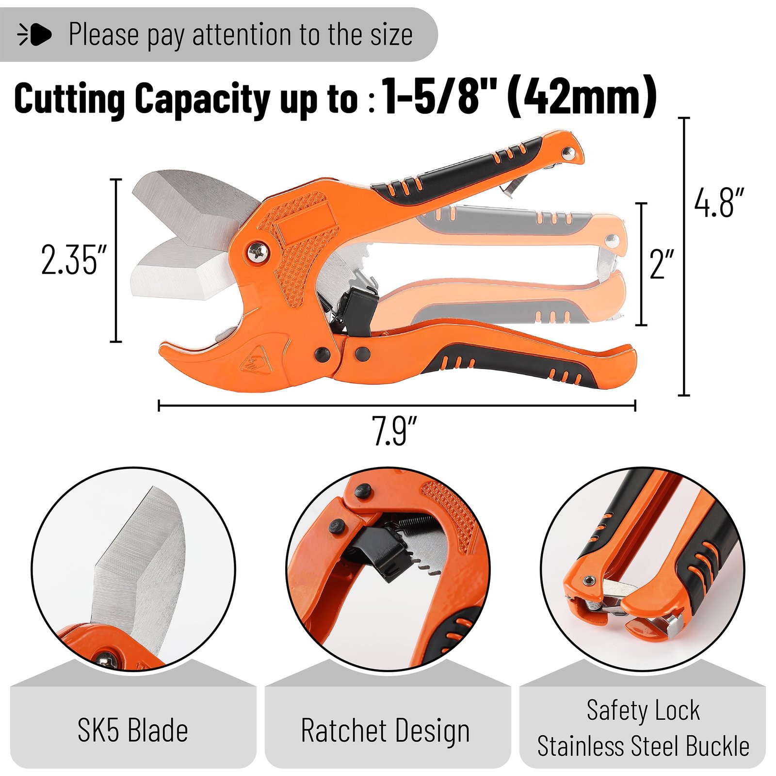 - The rubber-textured handle is comfortable to use, reliable to hold, and not easy to hurt. A stainless steel buckle is at the bottom of the tube cutter for easy storage. When you don’t use it, you can shrink the handles on both sides and lock the security lock to save space and prevent accidental injury.