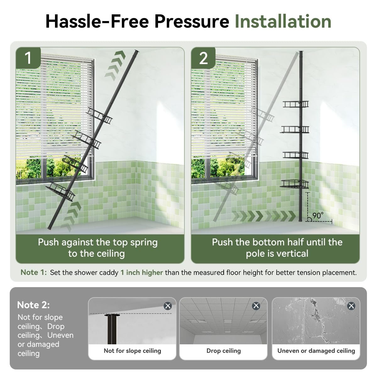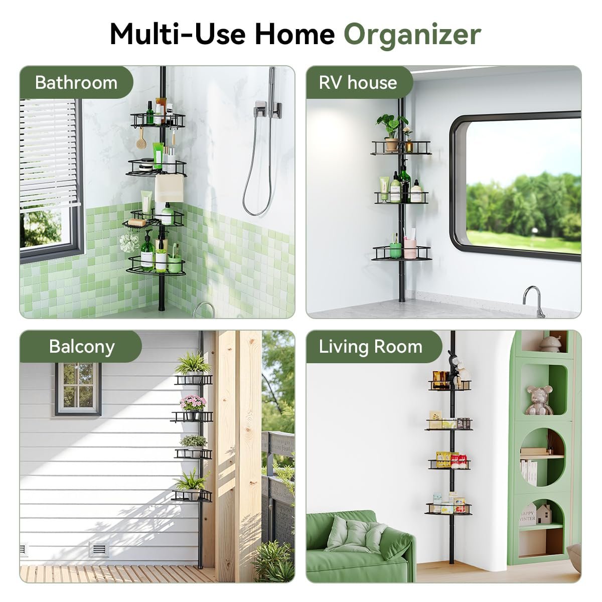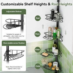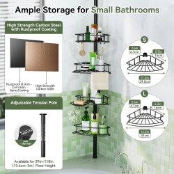 - 【 Height adjustable】Our shower caddy are designed with adjustable rods, which can be freely adjusted from 29 to 118 inches in height to fit all sizes of bathroom Spaces. With just a small corner, With just a small corner, you can easily achieve neat and organized storage (It is recommended not to use on fragile, unsecured, or hollow locations such as drop ceilings, glass surface, pipes, etc.)