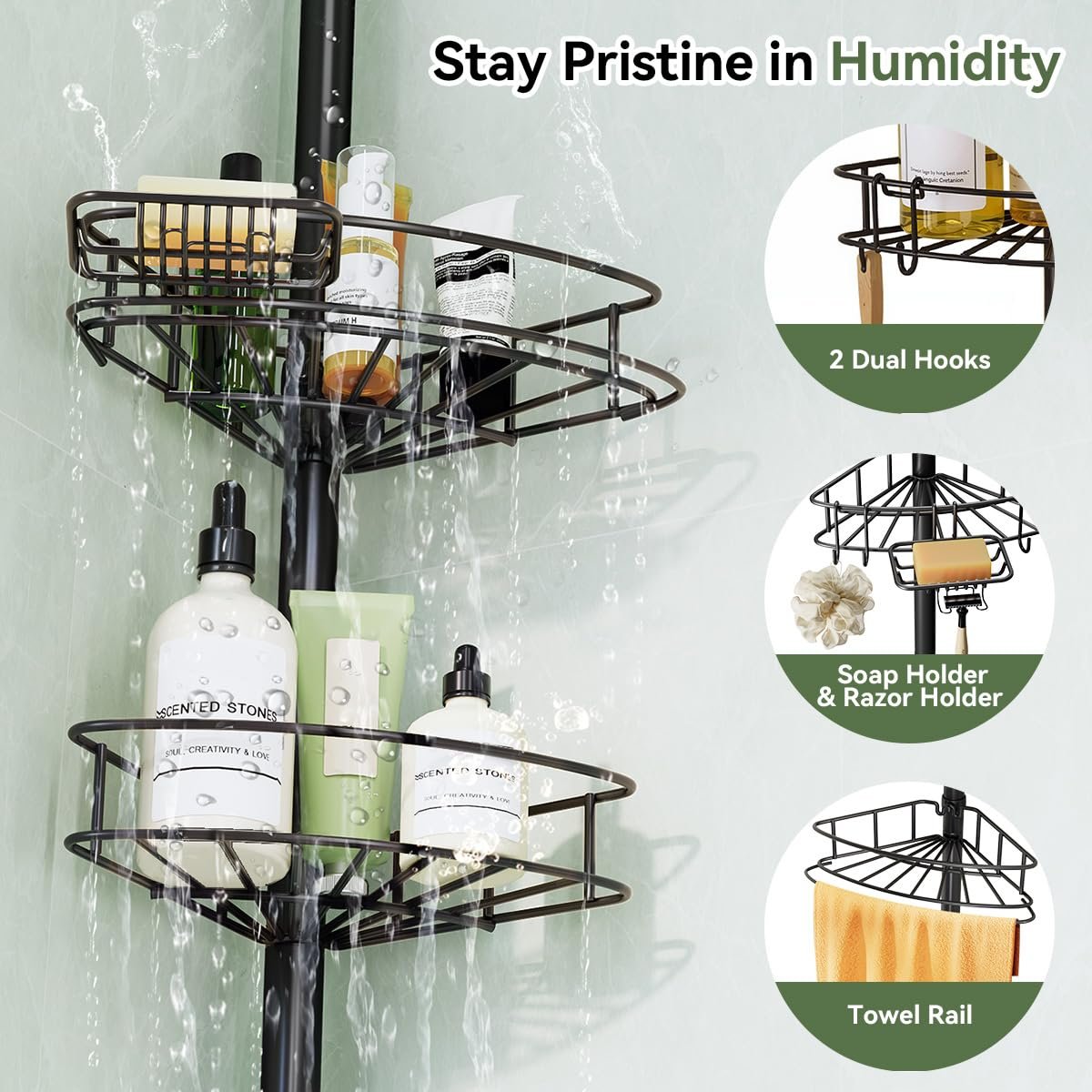 - 【Rustproof Material】Make of carbon steel, this shower caddy tension pole features a thick rust-resistant coating, making it suitable for use in damp environments such as bathrooms. The baskets are wire design, effectively preventing water accumulation and enabling efficient storage