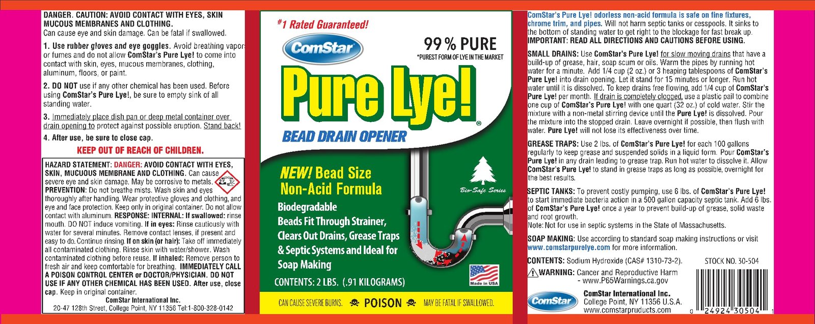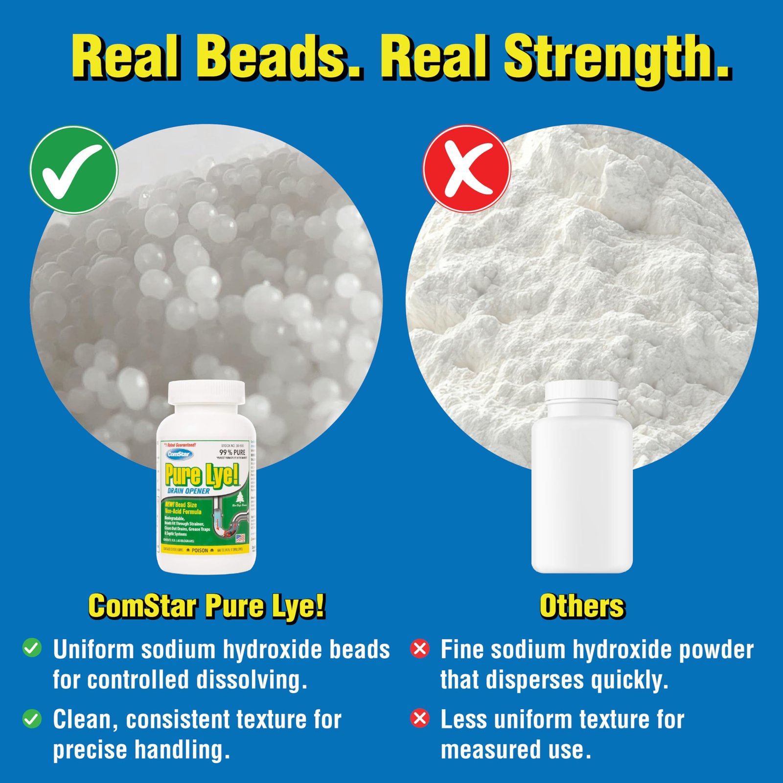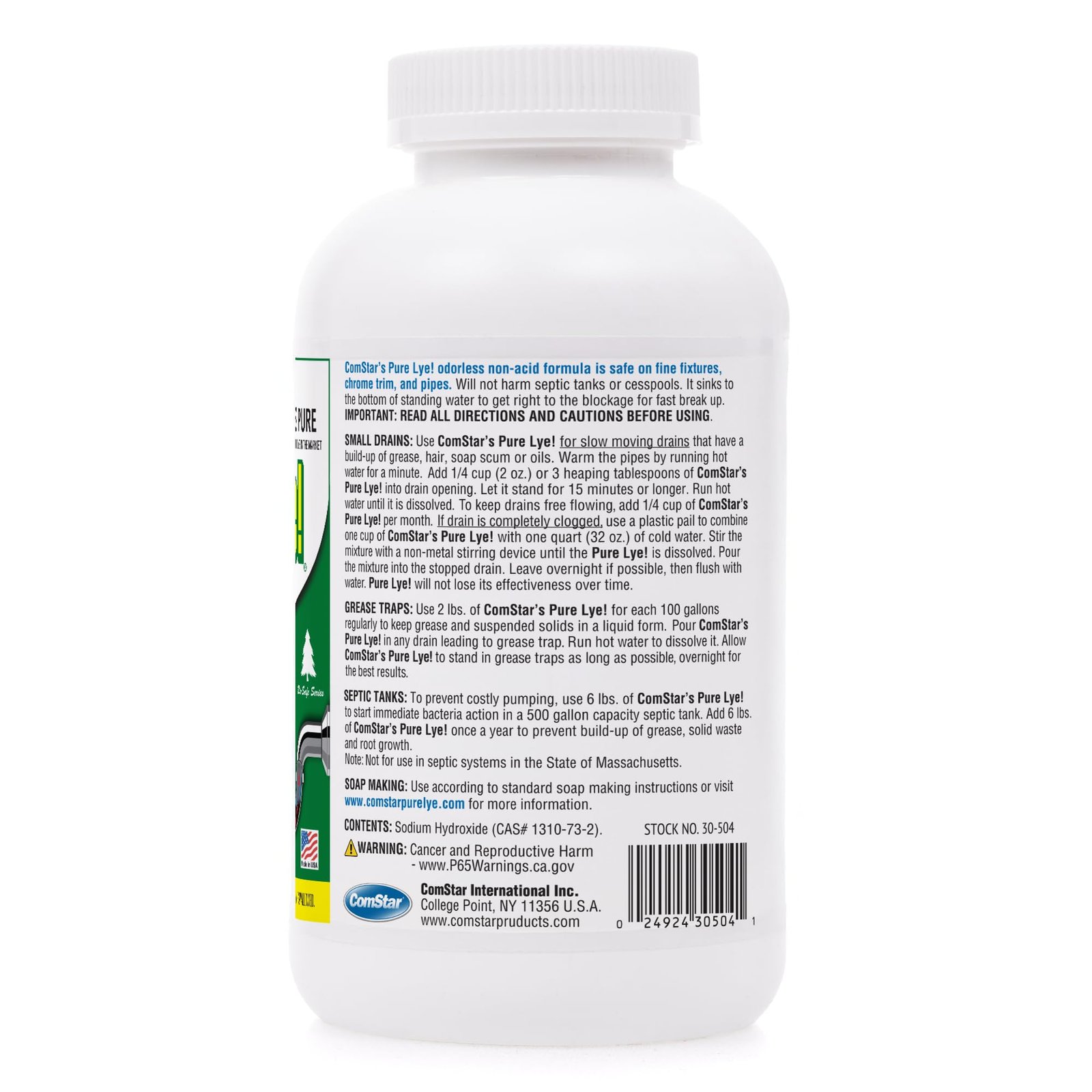 Details: ComStar Pure Lye is an industrial-strength environmentally safe, bead formula designed to clear out drains, grease traps, septic systems, and roots. ComStar Pure Lye is also a best-selling soap maker. This sodium hydroxide formula is the purest white, bead-size lye in the world—99% pure. A natural drain opener, ComStar Pure Lye is biodegradable and odorless with a non-acid formula that is safe on fine fixtures, chrome trim, and metal or plastic pipes. This amazing product clears out clogged and slow-moving drains, grease traps, and septic systems, without harming septic tanks or cesspools. Because of the unique bead shape, ComStar Pure Lye will sink to the bottom of standing water and attack the cause of the blockage for a fast break-up. ComStar Pure Lye does not stink or create fumes and has become a favorite drain-opening product for homes, schools, hospitals, cafeterias, and restaurants. ComStar Pure Lye’s small bead form is preferred for soap making. Unlike more common flake formulas, ComStar Pure Lye Beads do not clump together, create static, and dissolve quickly. Because of this, soap making is faster and easier with ComStar Pure Lye.