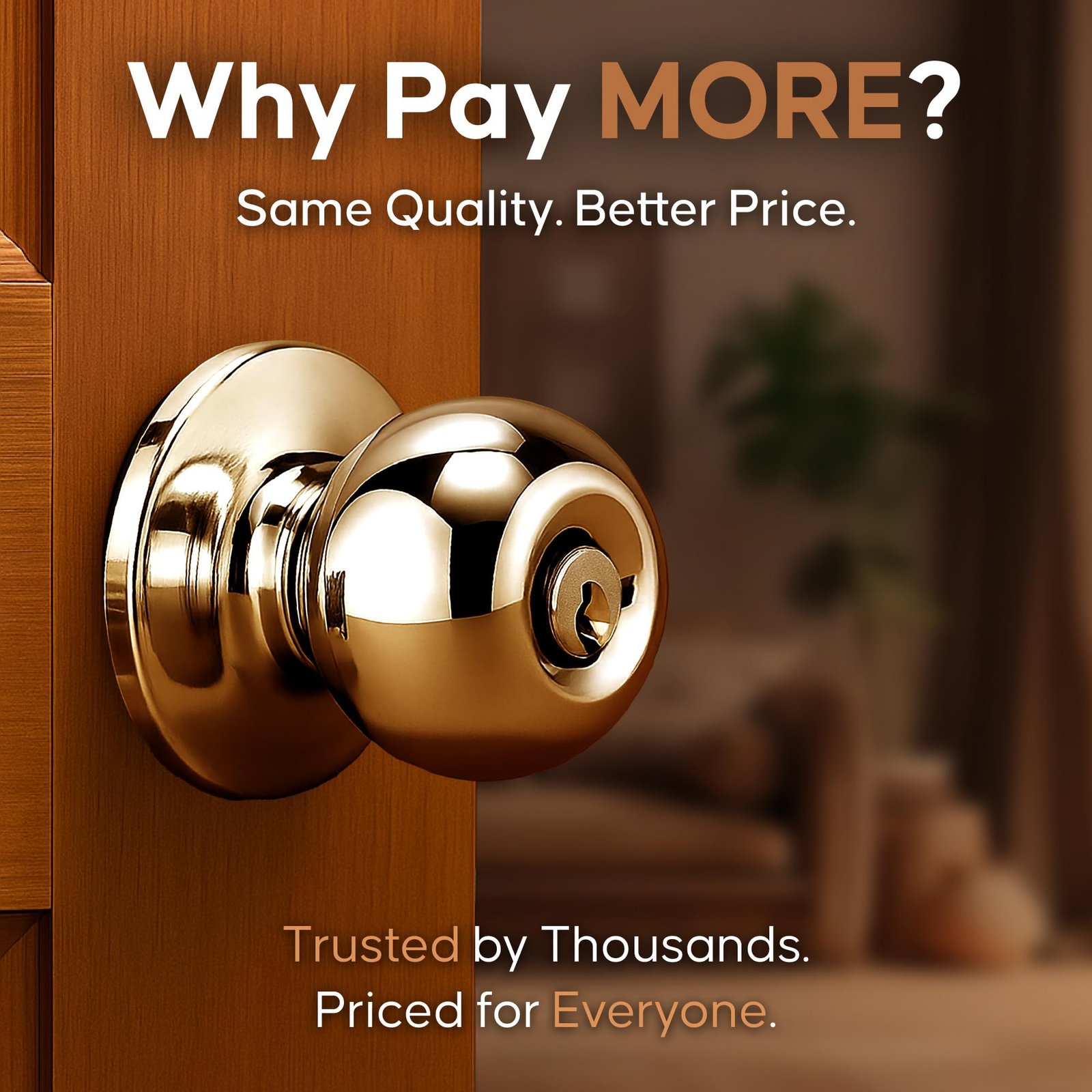 Get keyed privacy and performance where it matters. This exterior and interior entrance door knob is ideal for entrance doors, bathrooms, and any space that benefits from keyed locking. It delivers reliable function, long-term durability, and a polished finish that fits any décor. Perfect for DIY installation, it includes an adjustable latch and mounting hardware to fit standard doors. The all-metal design ensures years of smooth turning and dependable performance, while the polished finish offers clean, modern appeal that resists smudges and tarnish. Whether you’re replacing old hardware or outfitting a new space, this privacy knob installs easily, fits universally, and provides value without compromise. KEY BENEFITS ENTRANCE FUNCTION FOR INTERIOR AND EXTERIOR DOORS Keyed locking mechanism—ideal for entrance and bathrooms. EASY DIY INSTALLATION Installs in minutes using only a screwdriver. Includes everything you need: latch, screws, and step-by-step instructions. SLEEK, MODERN FINISH Polished Brass steel complements both modern and traditional interiors while resisting smudges and corrosion. STURDY BUILD FOR DAILY USE Reinforced metal construction offers lasting durability and a firm, smooth turn you can feel. VALUE-PACKED HARDWARE High-quality construction with a 30-day return window—so you can install with confidence and flexibility. HOW TO INSTALL: Remove old hardware using a screwdriver Align new latch and knob to pre-drilled door holes Secure with included screws Test knob and lock function before full use Fits door thicknesses from 1-3/8″ to 1-3/4″. Backset adjustable to 2-3/8″ or 2-3/4″. MAIN DETAILS: Function: Entrance – Keyed Lock Finish: Polished Brass Material: All-metal chassis with brass and steel components Backset: Adjustable to 2-3/8″ or 2-3/4″ Door Thickness Fit: 1-3/8″ to 1-3/4″ Handing: Reversible – works on both left- and right-handed doors Included: Knob, latch, mounting screws, installation instructions Security: ANSI Grade-3 Certified Return Policy: Voluntary 30-Day Return Guarantee