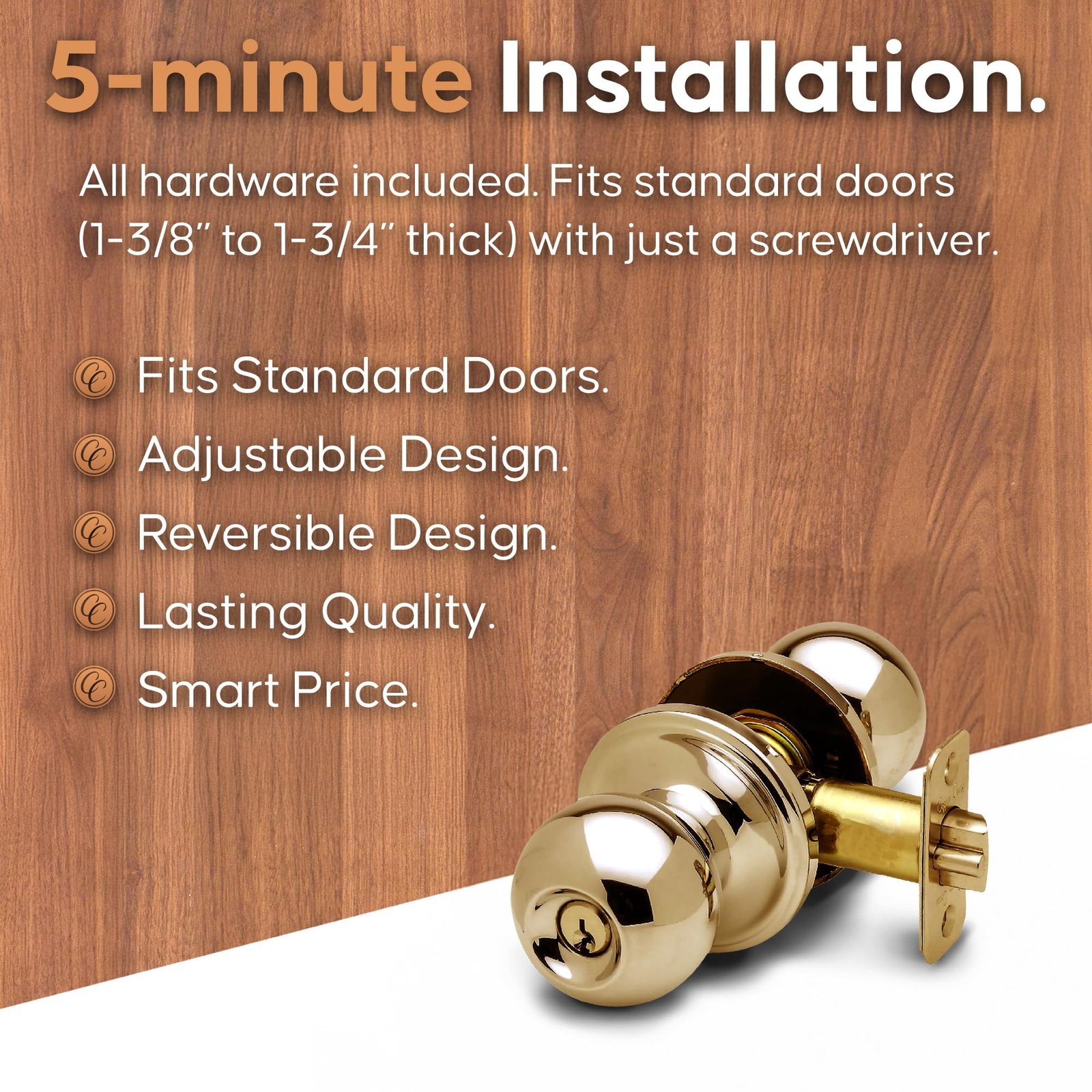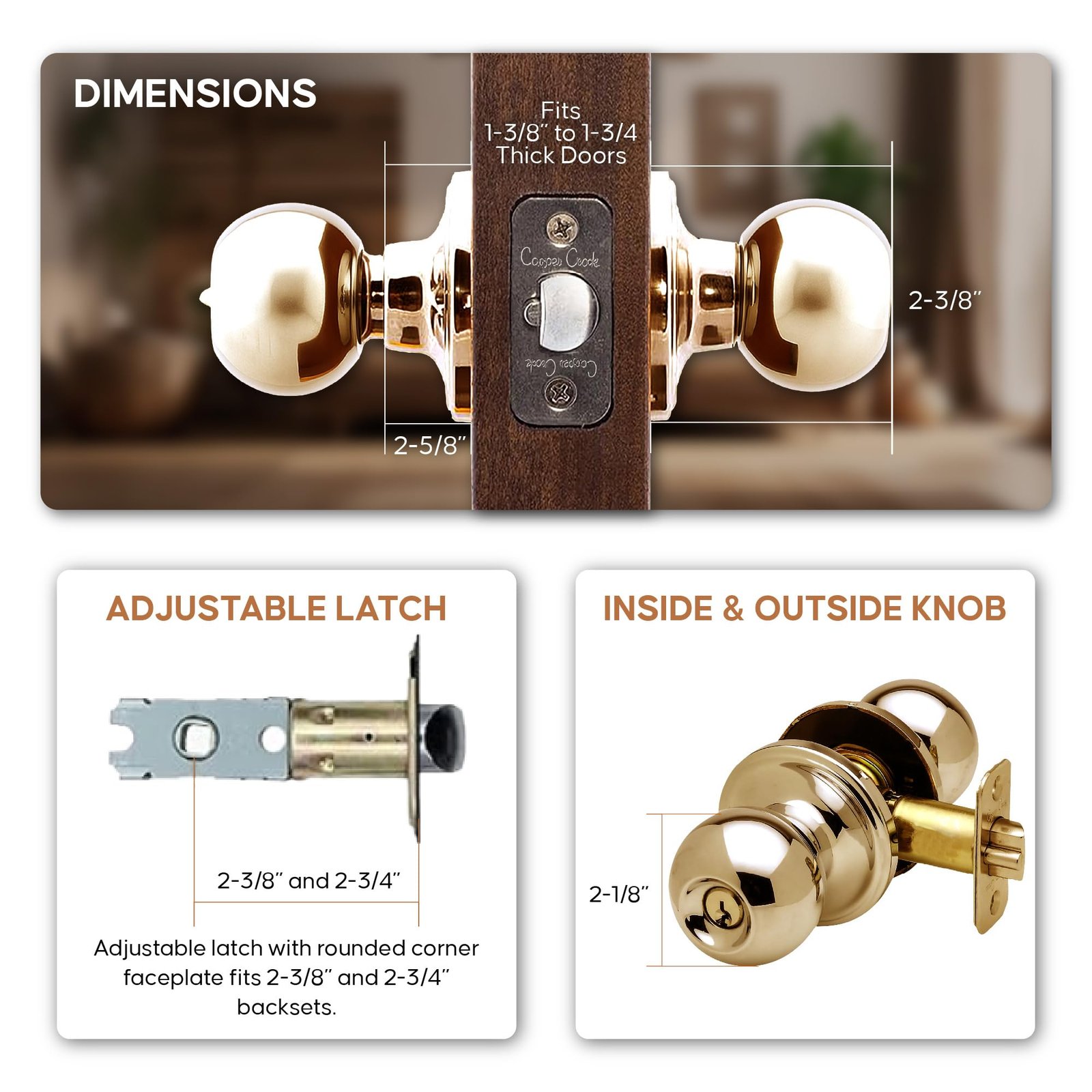 - 5-Minute Installation. Installs quickly with just a screwdriver. Fits all standard doors (1-3/8″ to 1-3/4″ thick) with the included hardware. Adjustable latch fits both 2-3/8″ and 2-3/4″ backsets.