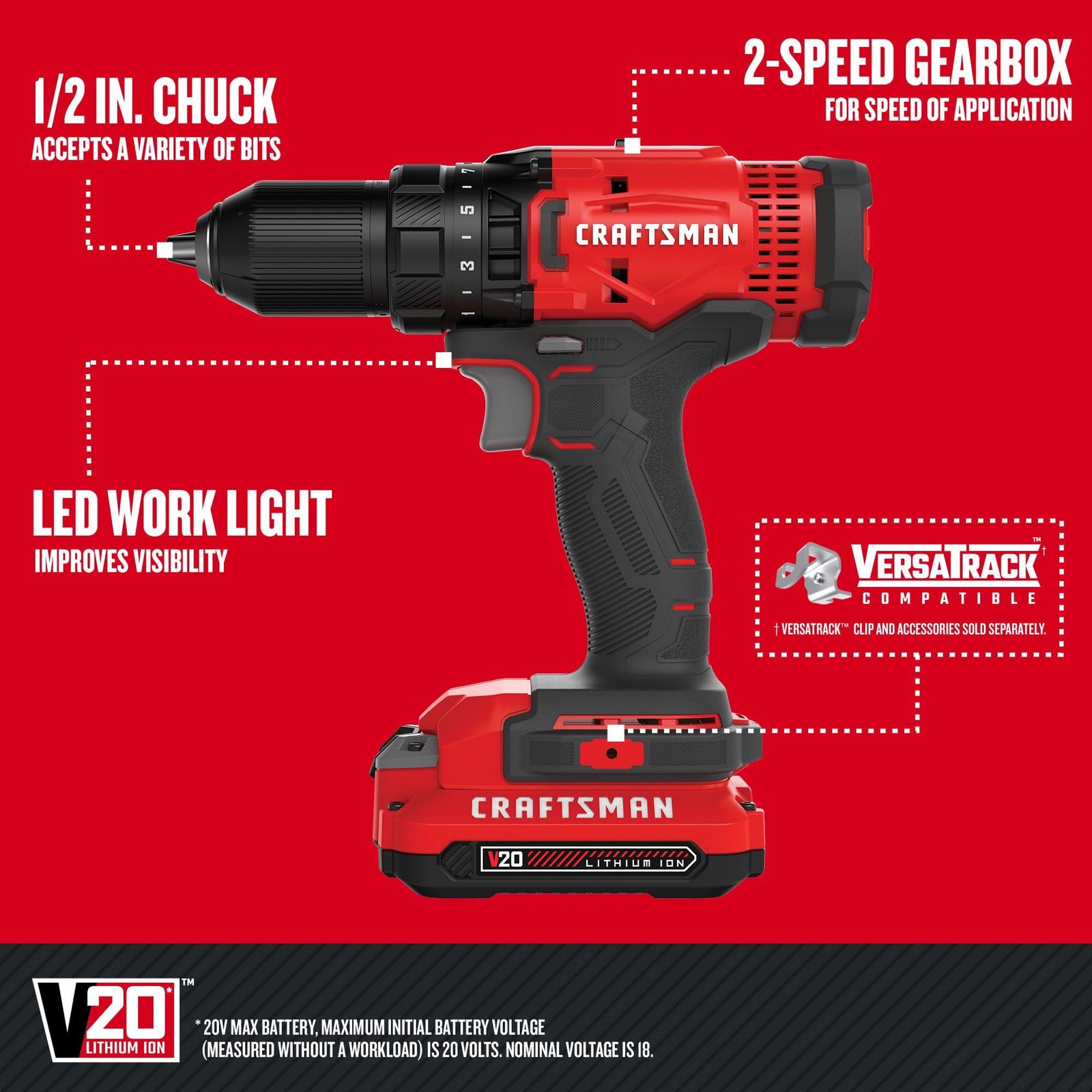 CRAFTSMAN V20 Cordless Drill/Driver Kit, 1/2 inch, Battery and Charger Included (CMCD700C1)