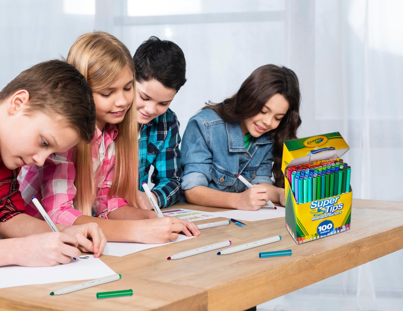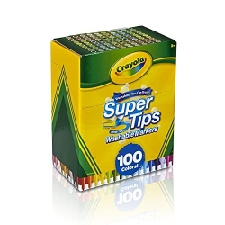 Details: Great for any creative project, Crayola Super Tips Washable Markers can be used to write, draw, or color in large areas. Each of these Super Tip Markers can be used to make thick or thin lines, providing versatility without having to switch between tips. This box of markers features 100 coloring tools, each in a different pigment. Choose from primary, secondary, and complementary colors to use as shading or blending markers for original designs, calligraphy, or to fill in your favorite coloring book. These non-toxic art markers are a great addition to art supplies for artists ages 3 and up. This product is ACMI Certified. Crayola bulk school supplies are a must have for kindergarten, preschool, and elementary school classrooms and teachers. Perfect for creative learning all year long!