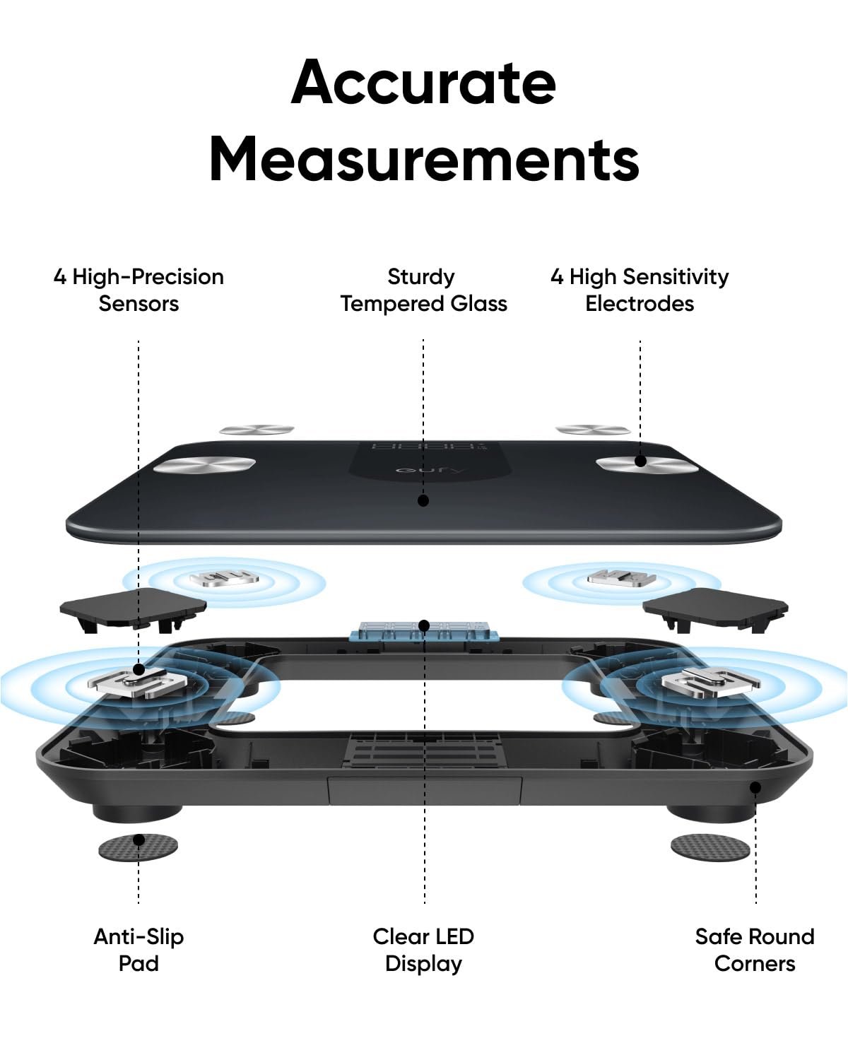 - [Compact Design] eufy A1 Smart Scale measures just 26 × 26 × 2.5 cm, making it ideal for small spaces. It can easily be stored underneath furniture for further convenience.