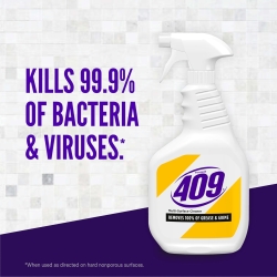 Details: Formula 409 Multi-Surface Cleaner Spray in Lemon Fresh scent is the ultimate cleaner, degreaser and disinfectant for your home. The antibacterial formula quickly cuts through tough grease and grime and disinfects, killing 99.9% of germs on bathroom and kitchen surfaces (1). Great for everyday use, this all purpose cleaner contains no bleach and leaves behind a Lemon Fresh scent. This household cleaner works great both indoors and outdoors on a wide range of hard nonporous surfaces including stovetops, sinks, countertops (1), microwave exteriors and more. (1) Use as directed on hard nonporous surfaces. For surfaces that may come in contact with food, a potable water rinse is required. (2) Influenza A virus, Herpes Simplex Virus Type 2, SARS CoV 2, when used as directed on hard nonporous surfaces.