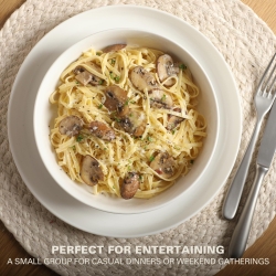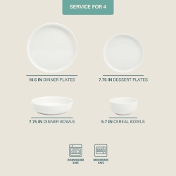 - A Complete Dinnerware Set: Service for 4 that includes 4 of each of the following dishes: 10.5” Dinner Plates, 8” Dessert Plates, 7.75” Pasta Bowls, and 6” Cereal Bowls