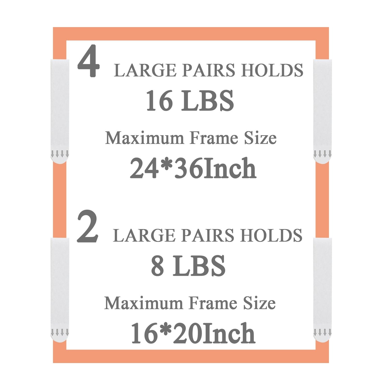 - No damage wall hangers:Four large wall hanging strips with adhesive pairs hold 16 pounds; maximum frame of 24 x 36 inches. Please take the one Hook strip (Hook surface) and one Loop strip(Fur surface) pinch tightly together. Two hook strips (Hook surface) or two Loop strips(Fur surface) can not stick to each other. When you want to remove the picture, carefully grasp the bottom corners and pull the picture straight towards you. Do not pull it at an angle or lift it upwards, as this may damage the wall.