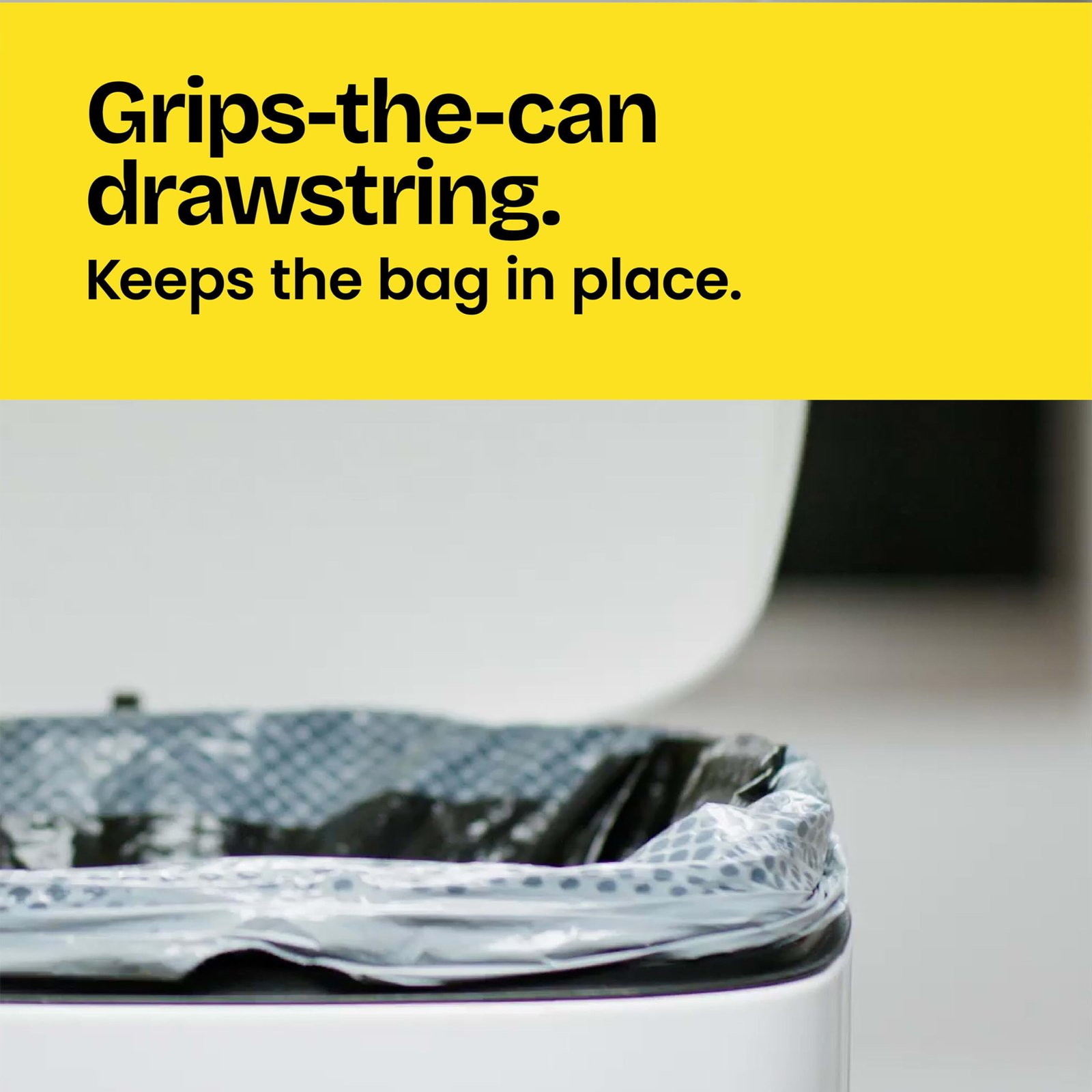 - GRIPS-THE-CAN DRAWSTRING: Durable 3-ply drawstrings grip the can so the tall trash bags stay in place and make it easy to close and carry; perfect for daily use in your active kitchen and home