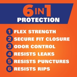 - 6-in-1 Protection-These Hefty 13 gallon trash bags offer a powerful combination of six features: flex strength, tough drawstring, patented odor control, and resistance to leaks, punctures, and rips