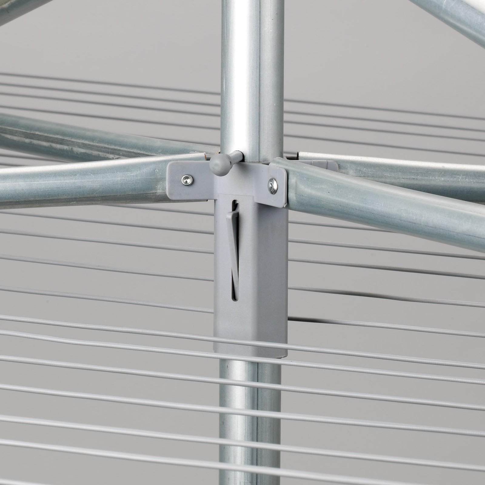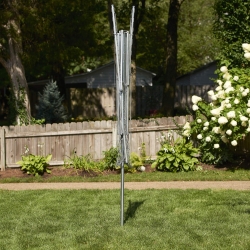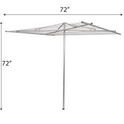 Details: Whether you’re switching to air drying for your laundry or looking for an upgrade for your current clothesline situation, this extra large parallel clothesline dryer is a smart and efficient solution. The dryer is designed with two main components: a galvanized steel post and aluminum top with durable plastic clotheslines. The top pivots, so you can easily turn it to reach every inch of clothesline when loading or unloading the dryer. This clothesline comes with a plastic ground sleeve that should (ideally) be cemented into the ground for maximum stability. When in use, the post rests securely in the ground anchor with the aluminum top in place. When not in use, the aluminum top folds down and the pole can be removed from the ground anchor, so you can remove the dryer during inclement weather (which we recommend) or if you otherwise need to remove obstacles from your yard. However, the steel and aluminum are galvanized, so they won’t rust if left out. The clothesline comes ready to assemble in just three parts, with the clotheslines pre-strung. To install with ground sleeve: 1. Dig a hole 8-12 inches in diameter and 20 inches deep. The hole should be wider at the bottom than at the top. 2. Fill the hole with about 3 inches of small rocks, then pour about 6 inches of concrete into the hole (or until concrete comes to the bottom of the ground sleeve when held flush with the ground). 3. Holding the sleeve in place, finish filling the hole with concrete (you may leave a small gap to fill in with dirt and grass if you wish). 4. Immediately run a stick or tube through the sleeve and through the concrete to the rock base to allow water to drain. 5. Insert the lower vertical pole of the dryer into the sleeve, then use a level to align the pole vertically. 6. Remove pole and allow concrete to set fully, then install your dryer.