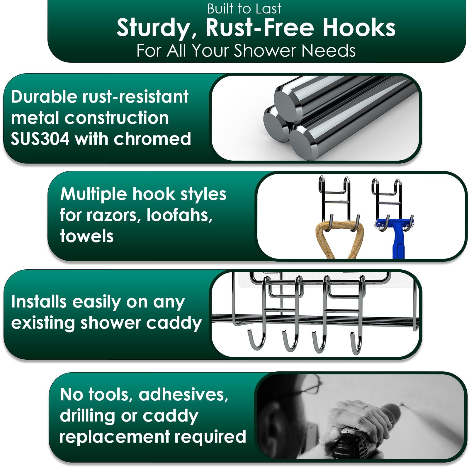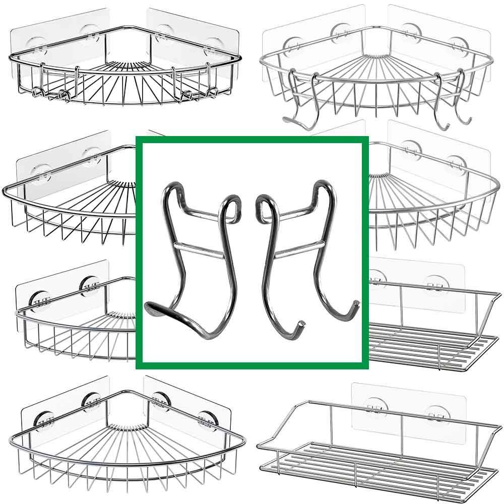 - [ RUSTPROOF MATERIAL ] These shower shelf hooks are made of SUS304 Stainless Steel with Chromed. No need to worry about rust anymore.