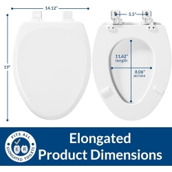 - COMPATIBLE WITH ALL ELONGATED TOILETS: This seat measuring 14.12 wide x 19 long fits all standard elongated toilets including American Standard, Kohler, Toto and more; watch our video above to learn how to measure