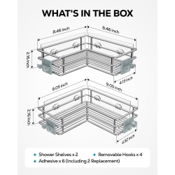 - Package Contents: 2 Corner Shower Caddy, 4 Plastic Hooks, 6 Adhesive, and lifetime after-sales service