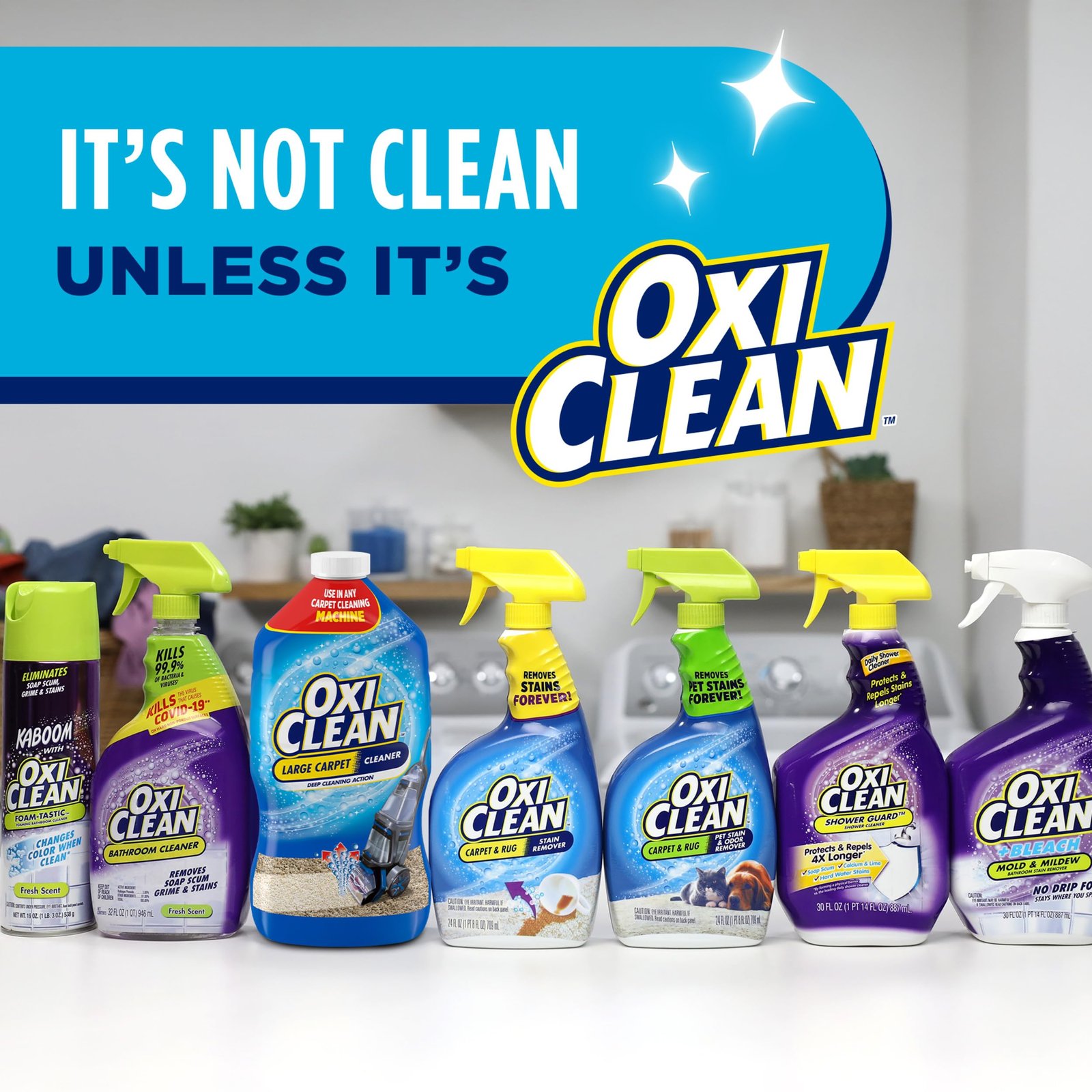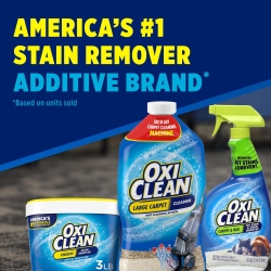 Details: Carpets are stain magnets: they get stepped on, spilled on and look dirty and dingy over time. With OxiClean Large Carpet Cleaner carpet shampoo liquid, you can make your large area carpets look fresh and clean. This carpet cleaning solution, from the makers of OxiClean, America’s #1 Stain Remover Additive Brand(1), uses the power of oxygen to get deep into carpet fibers, and lift away dirt and stains. It’s a versatile and effective carpet stain remover that is formulated for use in any carpet shampoo machine to remove stains and freshen your carpet. For best results, vacuum your carpet thoroughly to remove loose dirt and pre-treat tough stains with OxiClean Carpet and Rug Stain Remover. Then mix this carpet detergent with water following the machine’s recommended detergent-to-water ratio instructions. From stain removers and laundry boosters to household cleaners and much more, OxiClean offers a product to fit your needs. (1) Based on units sold