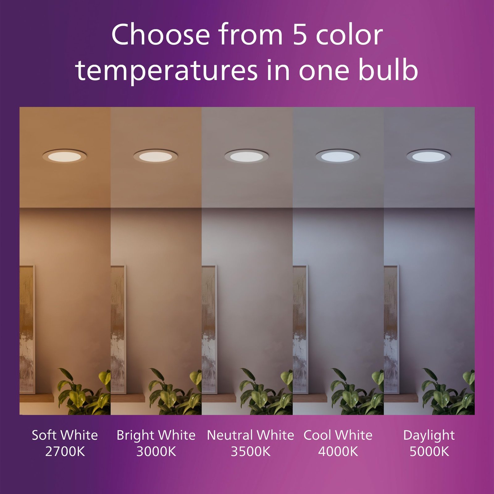 - 5 Color Temperatures (5CCT): Choose from 5 color temperature settings ranging from soft white (2700K) to daylight (5000K) using the switch located on the driver juction box.