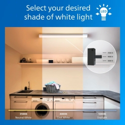 Details: Philips LED battens are perfect for general lighting, garages, storage areas, utility rooms, and basements. This ProjectLine LED luminaire is hardwired and designed for easy installation, long-lasting reliability, and energy-efficient performance. For maximum versatility, you can choose between three selectable color temperatures and three wattages to always achieve the right illumination for each space. This pack contains two high-brightness, dimmable battens.