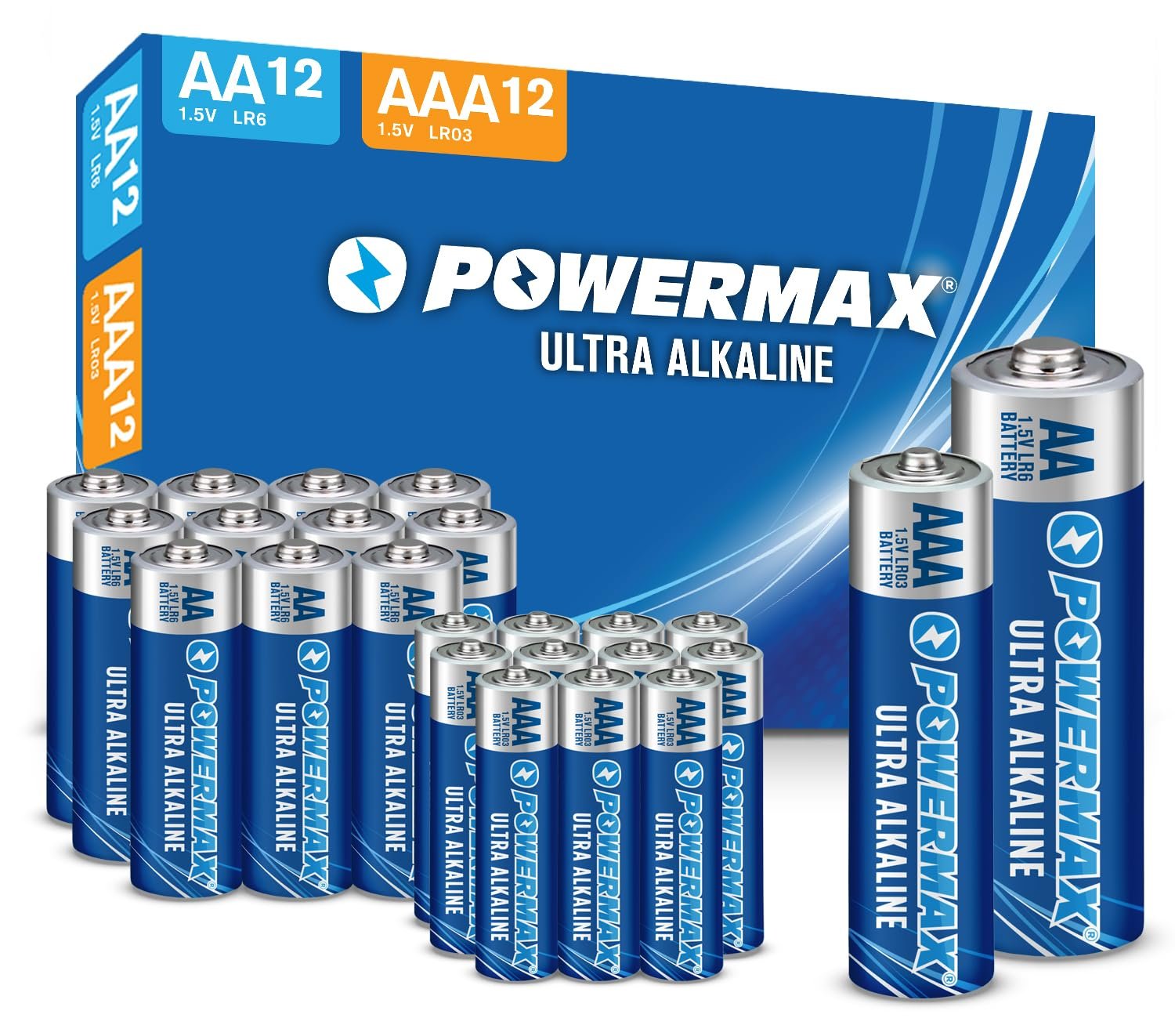 Details: Powermax AA and AAA Alkaline Batteries are equipped with advanced technology which provide reliable and long-lasting performance that you can count on, making them perfect for daily use in your home. Powermax alkaline batteries perform better than the competition in high-drain and super high-drain devices, and provide consistent discharge performance, making them very valuable for long-term use. This reclosable assortment pack includes 12 size AA and 12 size AAA batteries that deliver the right amount of power for your needs. Our Powermax alkaline battery multipack is great to have on hand for a variety of everyday household and office devices, including clocks, remote controls, game controllers, digital cameras, toys and more. Powermax AA and AAA alkaline batteries won’t leak and are designed to last ten years in storage. The 1.5 V batteries in our set contain no mercury or cadmium, making them a smart choice for your family and for the environment. At Powermax, our mission is to provide trusted and dependable power for everyday needs.