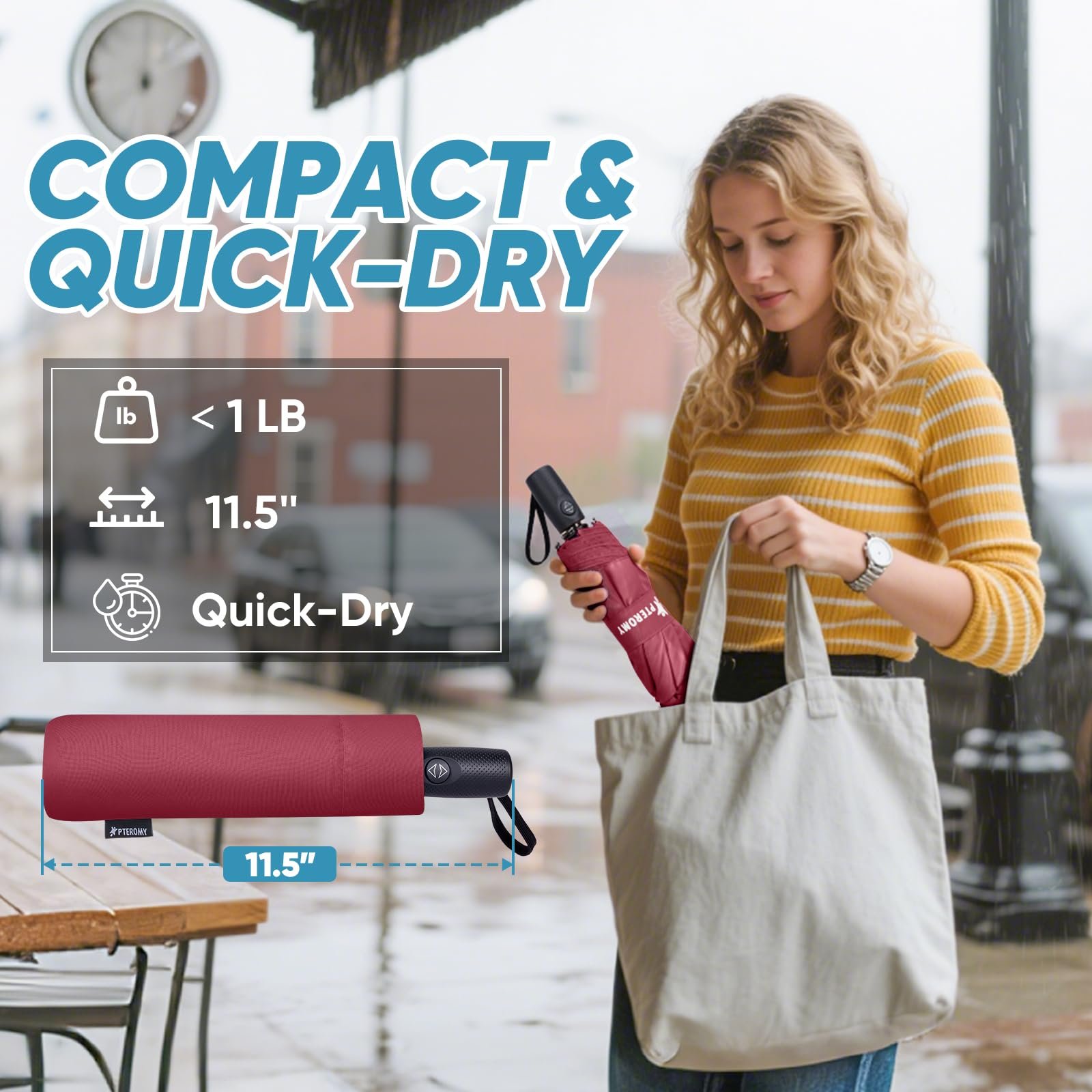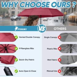 PTEROMY Windproof Compact Travel Umbrellas are designed for reliable protection against rain and sun; making them an excellent companion for daily commuting and travel; This travel umbrella compact features a durable double canopy with a reinforced resin frame and 9 fiberglass ribs; ensuring strong windproof performance and rust resistance; The one-button automatic open and close function provides quick and easy access during sudden showers; Made with a high-density, quick-dry two-layer canopy; this small umbrella for travel repels water efficiently to keep you dry and your belongings clean; With a 42-inch arc for full coverage and a compact fold size of 11.5 inches; this portable umbrella fits easily in bags, backpacks, or car doors; Whether you need a mini umbrella for purse, a folding umbrella for daily use, or a windproof umbrella for travel, the PTEROMY umbrella compact meets your needs with style and durability