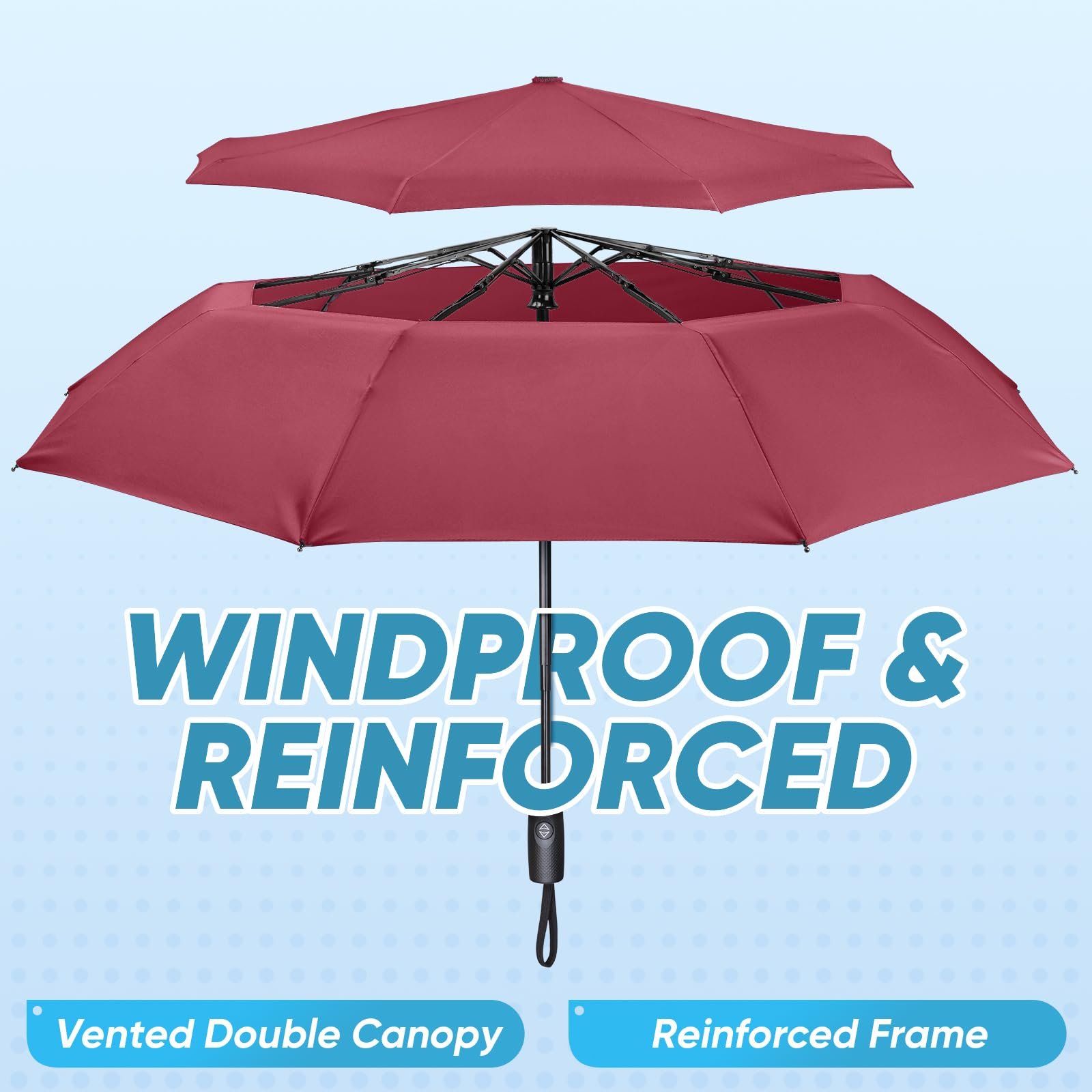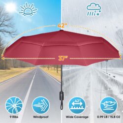 - Windproof Double Canopy: Designed with a vented two-layer canopy to allow wind to pass through, and a reinforced resin frame with 9 sturdy fiberglass ribs, this compact umbrella resists wind and rust, providing durable protection for rainy and windy commutes