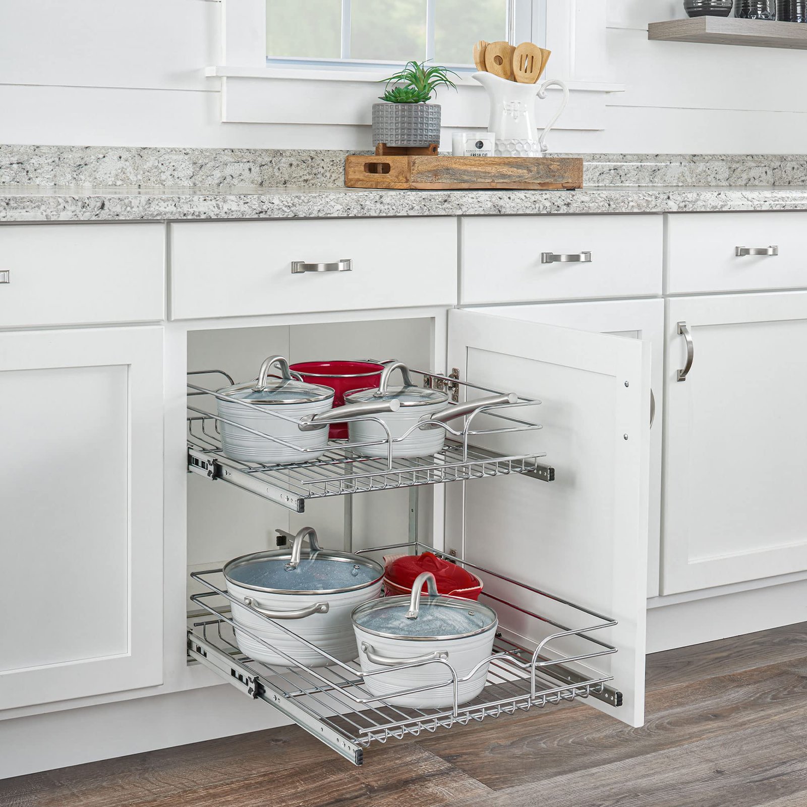 - Cabinet Pullout Organizer: Upgrade and maximize your kitchen storage with this sturdy 2-tier sliding wire basket system from Rev-A-Shelf; 100lb rated slides on each basket makes it perfect for pots, pans or appliances