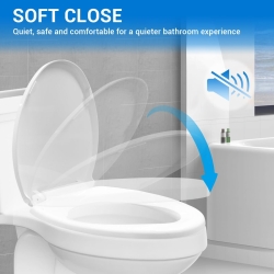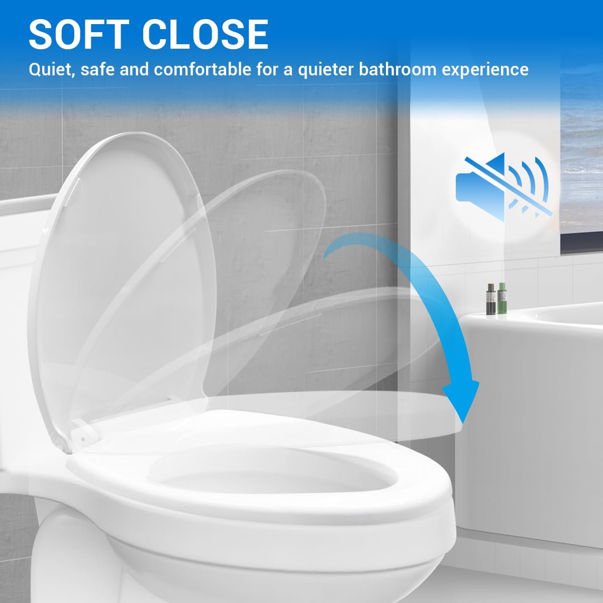 - 【Soft Close – No Slamming or Noise】The soft close toilet seat is designed with a quiet, slow-closing mechanism to eliminate slamming and reduce noise. Enjoy a peaceful experience with every use—perfect for nighttime and shared bathrooms.