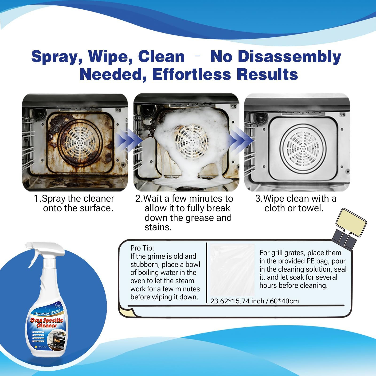 - [EASY SPRAY-AND-WIPE OR SOAK SYSTEM] Simply spray the liquid onto greasy surfaces, wait a few minutes, and wipe clean. For heavily soiled oven racks and grill grates, use the included extra-large PE food-grade bag and grease cotton pad. Soak racks inside the sealed bag for several hours—no messy hands, no scrubbing