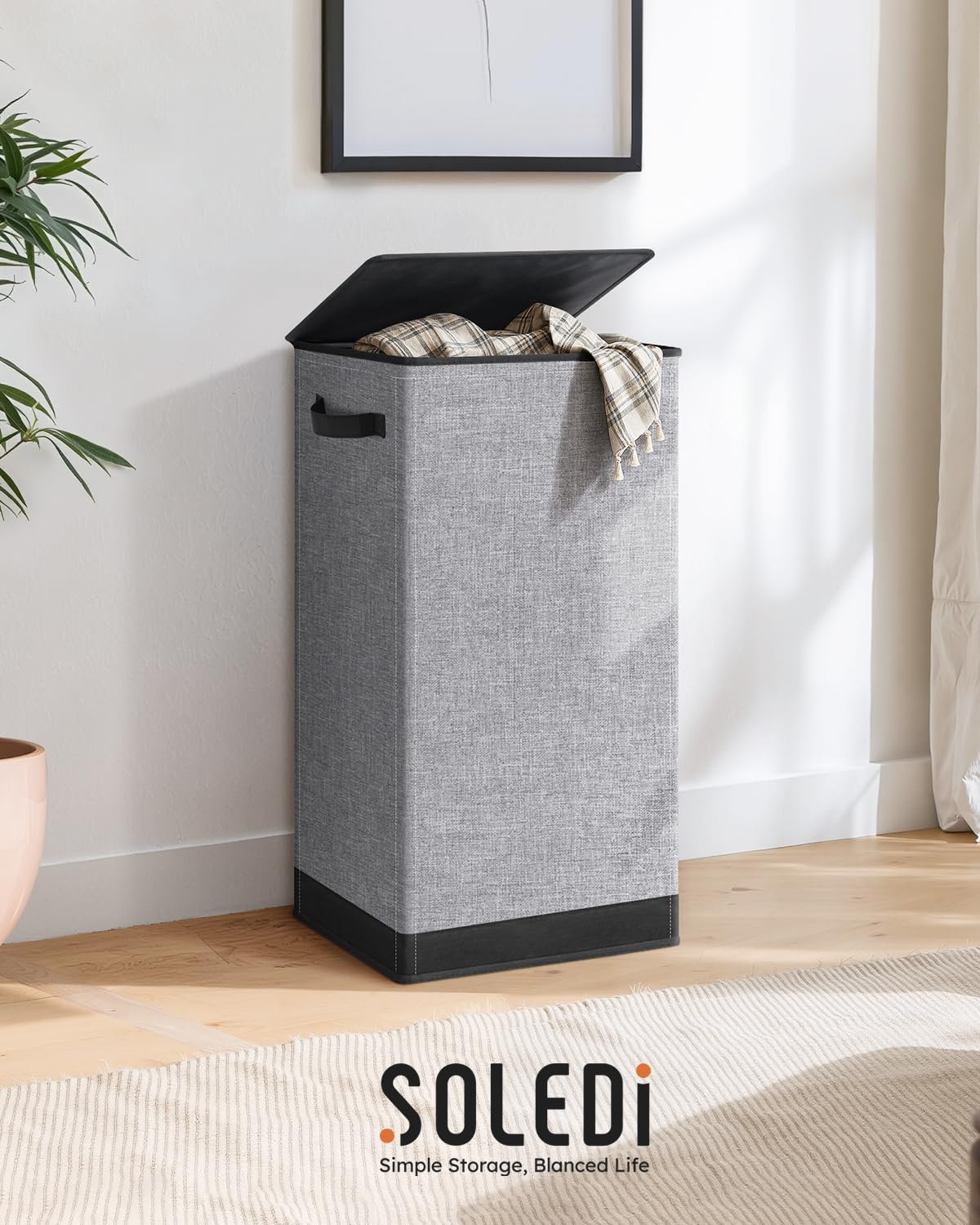 - 【100L Super Capacity】SOLEDI clothes hamper standing size 16.3″L×12.4″W×29.9″H, 100L large capacity clothes bin to meet the week’s change of clothes storage, reduce the number of weekly trips to the laundry room. 100L tall laundry basket is large enough to hold all the family member’s clothes or children’s toys. Good choice for campus dorms or family life.