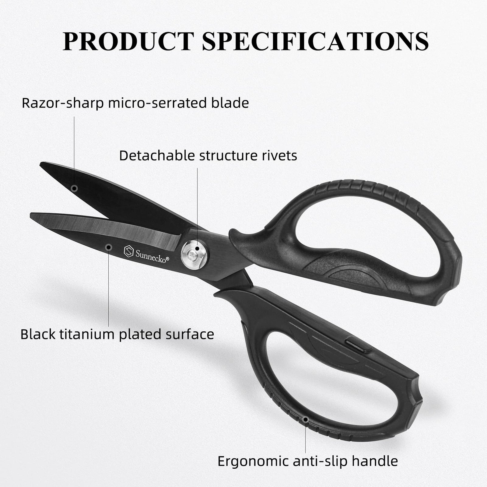 - Extra Sharp Kitchen Scissors – Our heavy duty scissors are equipped with fine serrations blades that greatly improve sharpness and control when slicing through tough materials like chicken bones and thick vegetables.