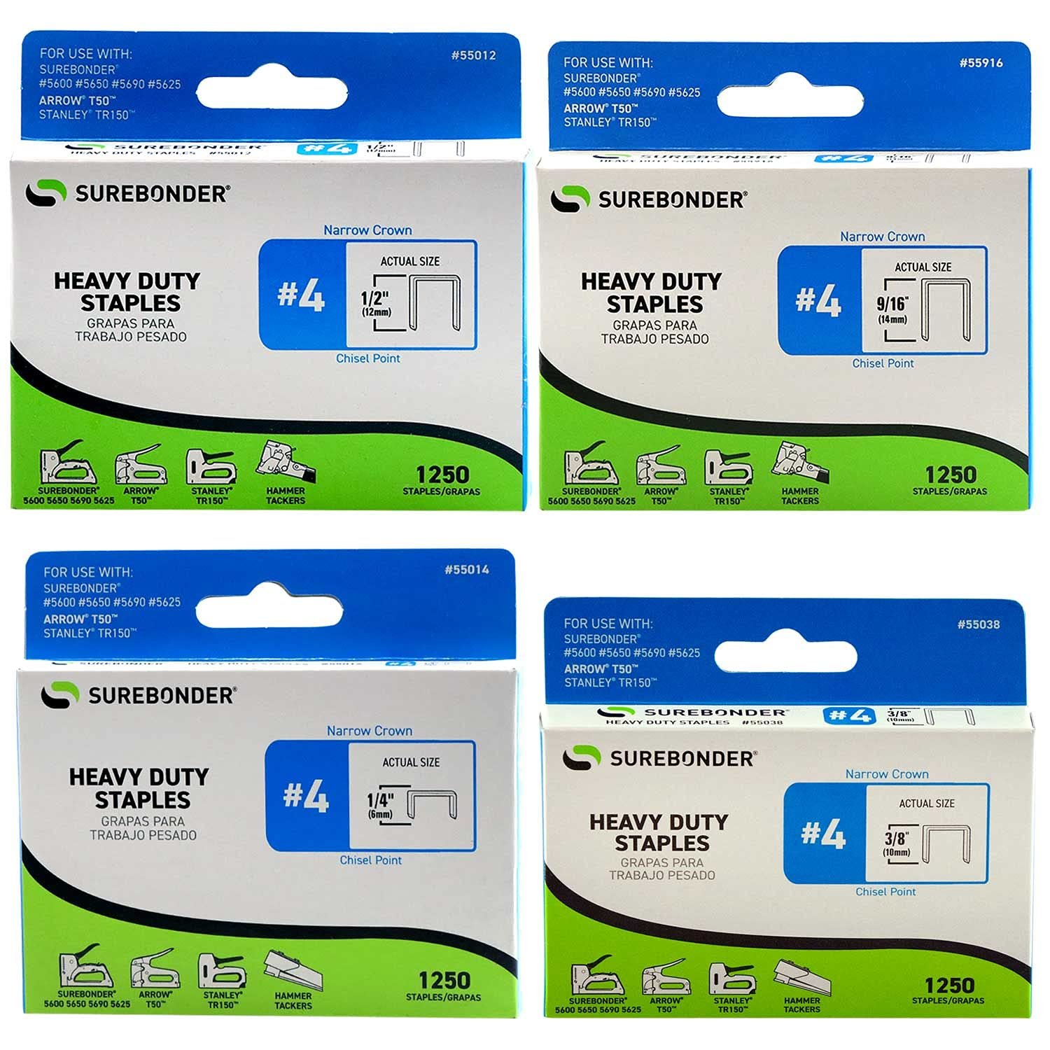 Details: Avoid multiple trips to the hardware store with the 5,000 Variety Staple Pack by Surebonder. Ready for any project, the pack contains four staple sizes 1/4, 3/8, 1/2, 9/16 and includes 1,250 staples of each size. These heavy duty staples are electroplated-zinc coated for moisture and rust resistance. Surebonder 55599 4 Staples, Arrow T50 Type, Heavy Duty, .417-Inch Narrow Crown Staples. ANSI Z87.1 Always wear safety glasses.