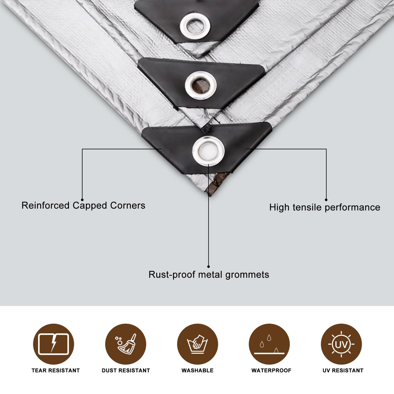 - STRONG GROMMETS REINFORCED EDGES:The protective waterproof tarp has a 14 x 14 weave count, reinforced edges and metal grommets every 24 inches. The tear-resistant material is super durable while the metal grommets allow you to tie down the tarpaulin cover easily, using bungee cords or a strong rope.