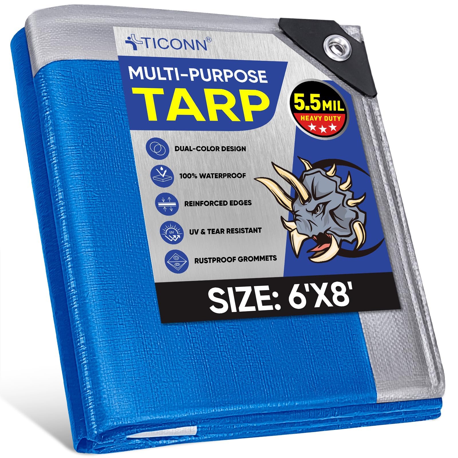 TICONN Heavy Duty Tarp Cover, Extra Thick Tarps Waterproof Tear and Rip Proof UV Resistant Tarpaulin with Reinforced Grommets and Edges (5.5 Mil, 6’x8′)