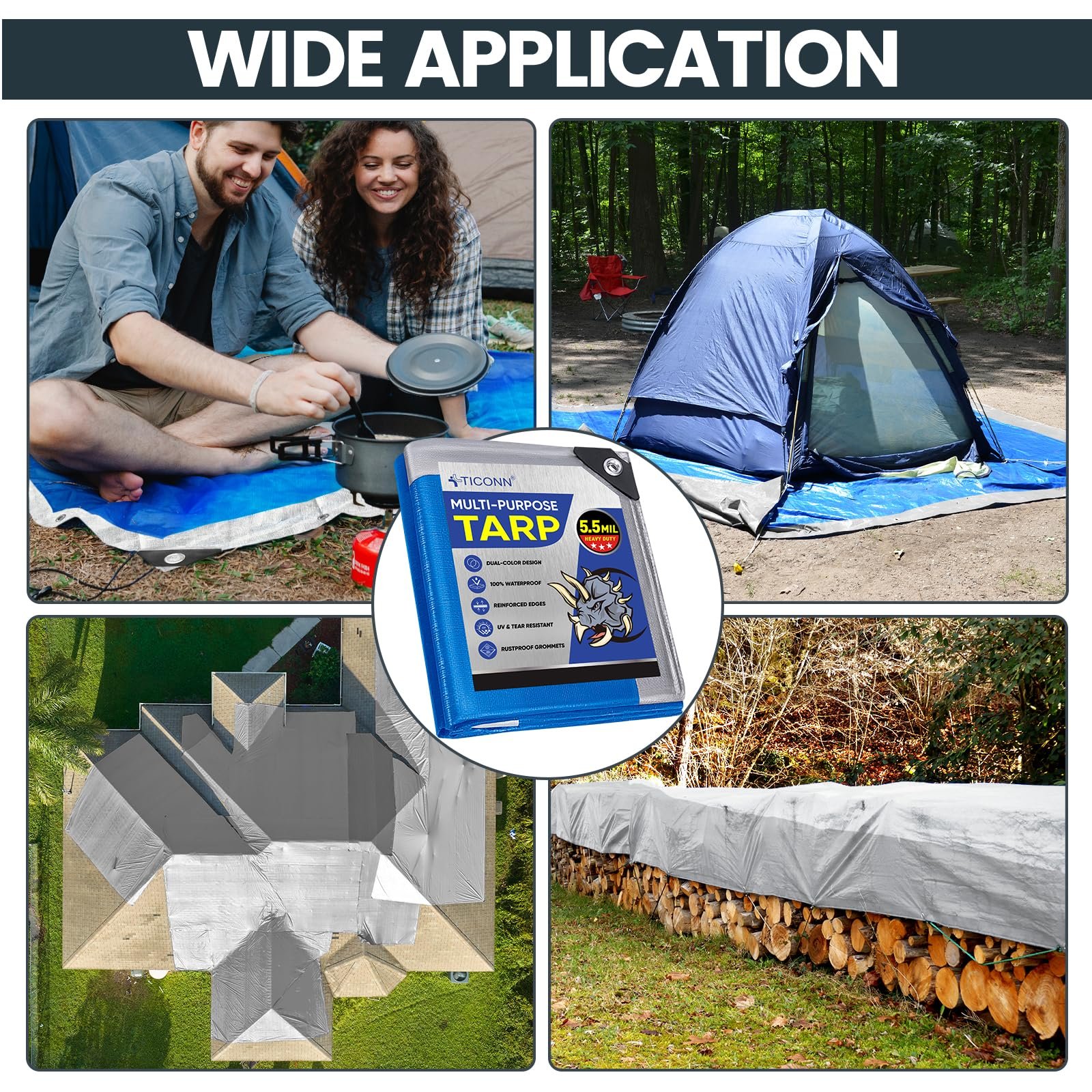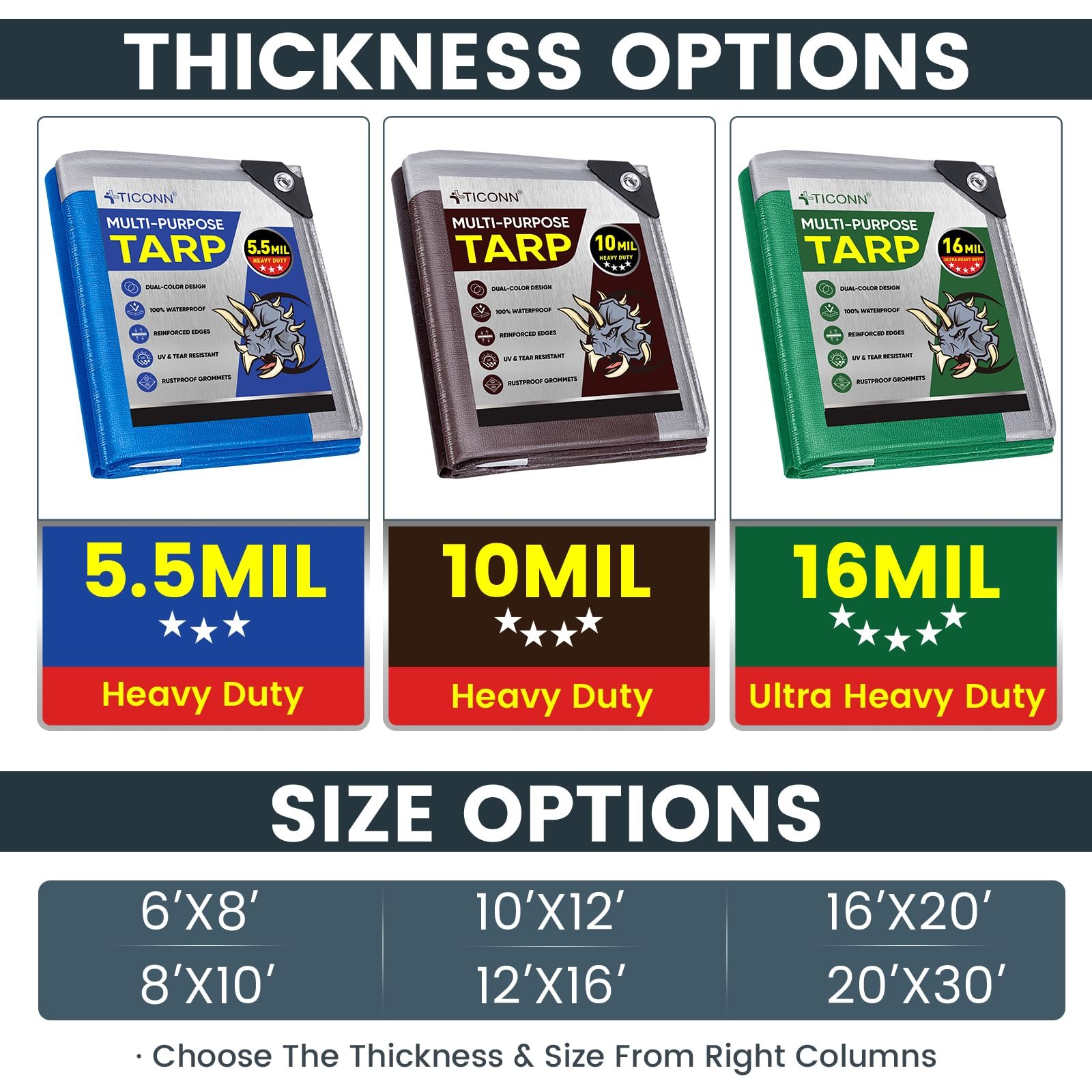 • [PREMIUM QUALITY MATERIAL] Crafted with top-quality materials, the TICONN plastic tarp is built to last. We offer 5.5, 10, and 16 mil thick water proof, UV resistant polyethylene fabric large tarp with size like tarps heavy duty waterproof 20×30, tarps heavy duty waterproof 8×10 and so on.