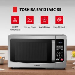 Details: This Toshiba 1.2 Cubic feet 1100 watt Stainless Steel microwave is the ideal size for apartment kitchens or office break rooms. Sensor reheating lets you optimally cook six of the most popular food items with the touch of a button. Choose from ten power levels up to 1100 watts. The large digital display has a clock function and can also display a countdown timer as well as the cooking time remaining. Program up to three favorite time and power combinations for additional one-touch convenience. Easily open or close the microwave with the large, easy-to grip door handle. The Stainless Steel exterior looks good in any kitchen. Voltage – 120V-60Hz.