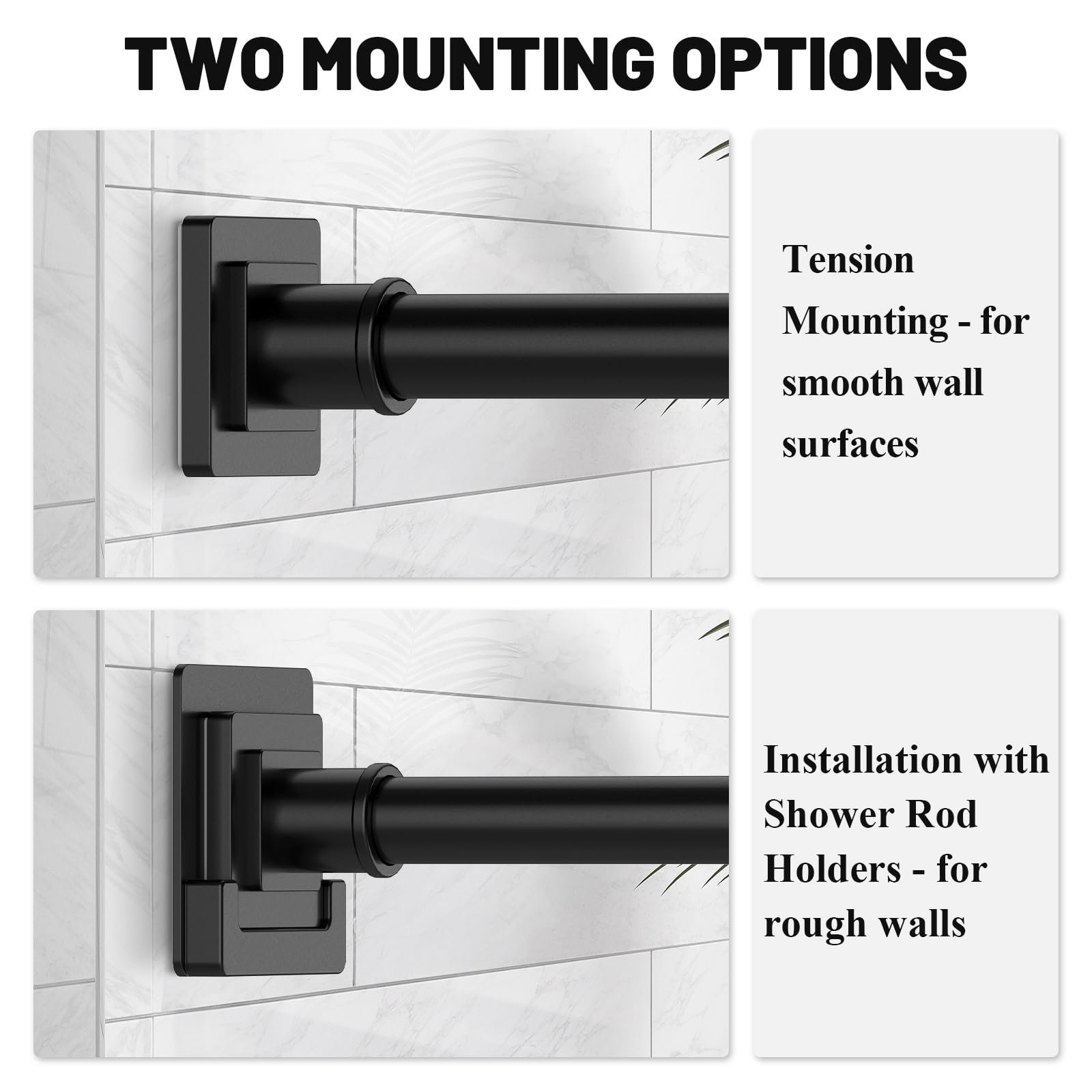 • Shower Rod with Holders: The black shower curtain rod can be installed in two ways: Rough walls can be installed using the holders. Smooth walls are mounted using the tension provided by the spring.