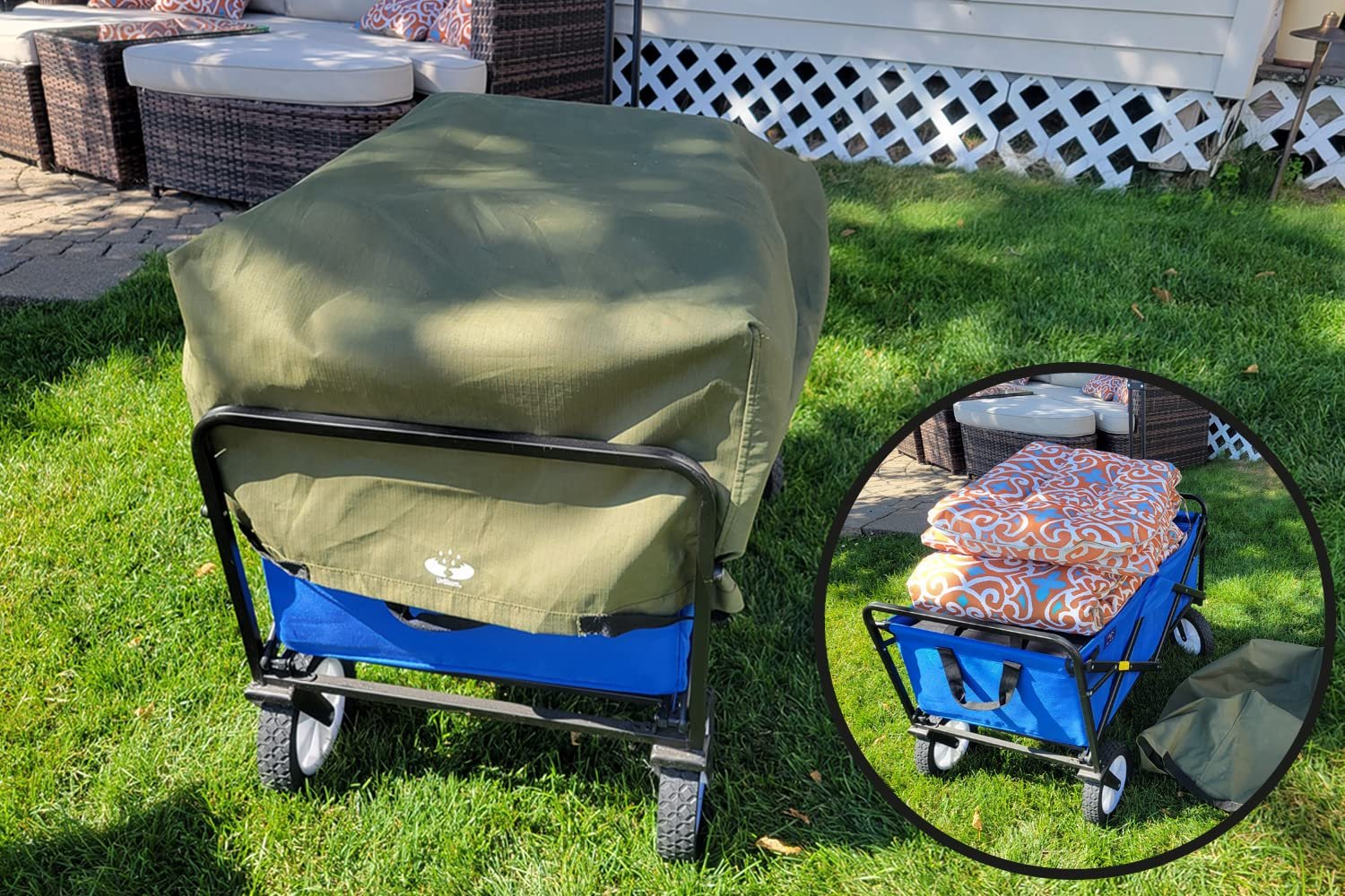- WEATHERPROOF AND VERSATILE: This wagon liner doubles as a reliable cart cover, offering year-round protection for your valuable items inside your utility wagon. Safeguard your goods from unexpected rain showers, dust buildup, and harsh outdoor elements. Whether you’re transporting tools or garden produce, our versatile heavy-duty accessories ensure your items stay dry, clean, and secure in your foldable wagon.