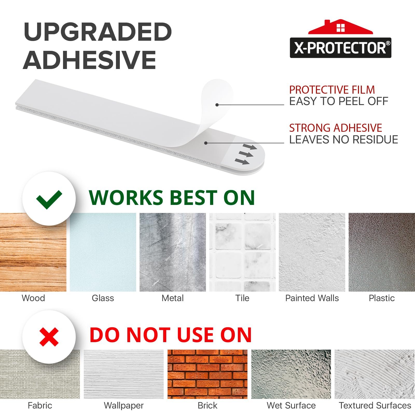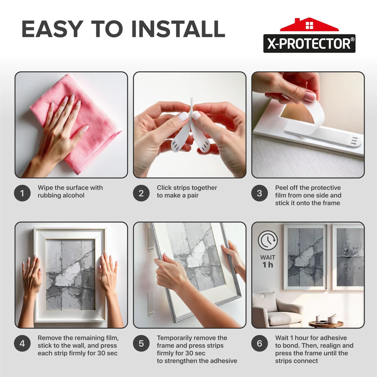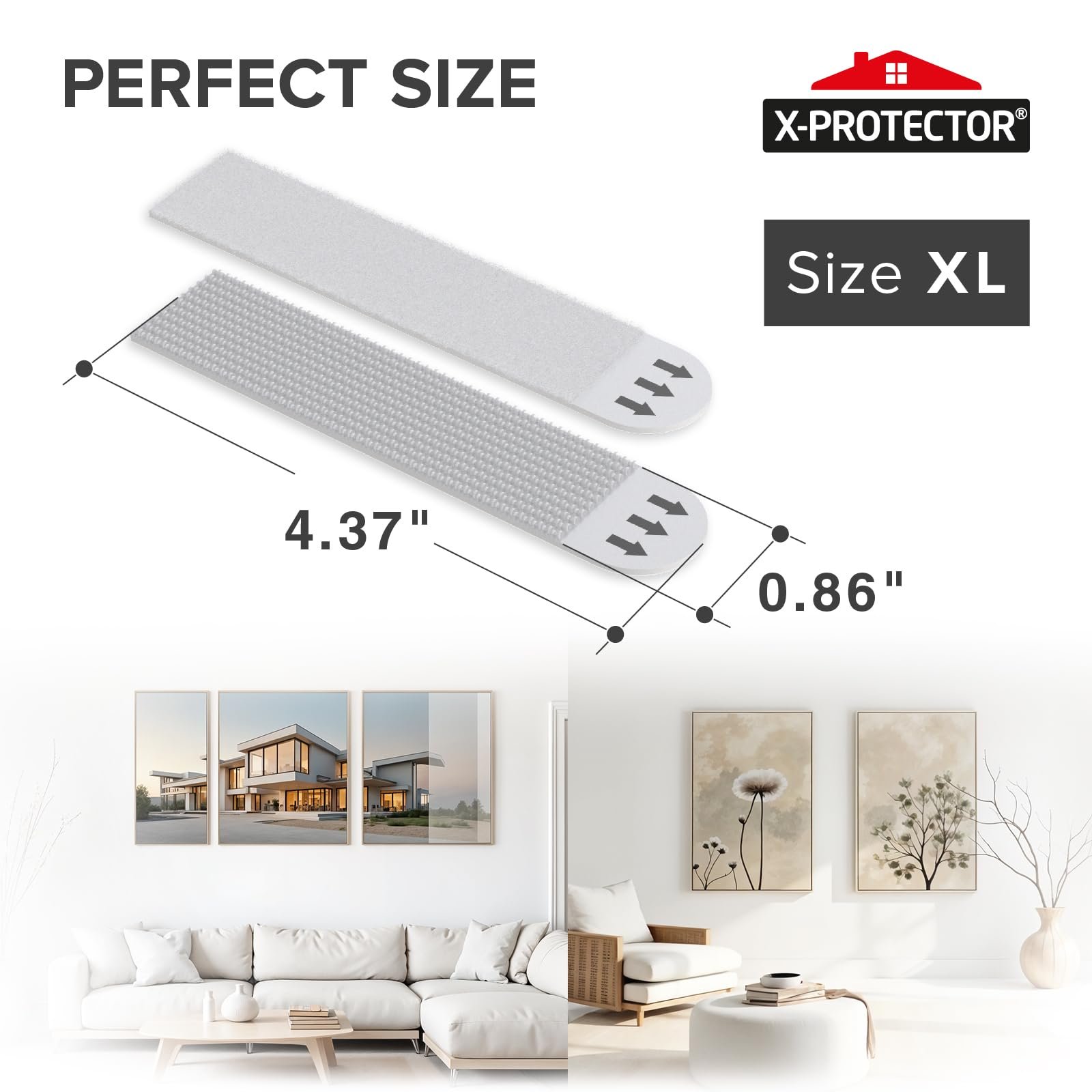 Details: Looking for a hassle-free way to decorate your space without damaging your walls? X-Protector No Damage Wall Adhesive Strips are the ultimate solution for securely hanging your photos, artwork, and decorations while keeping your walls flawless. Say goodbye to nails, screws, and sticky residue – our frame hangers without nails offer a clean, reliable alternative that ensures your walls stay in perfect condition. X-Protector strips for hang pictures without damaging walls are designed to work on a wide range of smooth surfaces, including painted walls, finished wood, tiles, glass, metal, and plastic. Whether you’re hanging family photos, decorative artwork, or seasonal decorations, picture hanging tape provides a secure hold. Please note: For best results, avoid using on wet, rough, or wallpapered surfaces. With X-Protector Frame Stickers for Wall, removal is just as simple as application. When it’s time to redecorate or reorganize, gently pull the strip downward to remove it cleanly – no tools, sticky residue, or damage left behind. This makes no damage picture hangers perfect for renters, homeowners, or anyone looking for flexibility in their wall décor. Each set of X-Protector removable wall adhesive strips offers incredible strength. Just 4 sticky hangers for walls can support up to 24 lbs, making them ideal for hanging heavier items. For best results, ensure the surfaces are clean and dry before applying. If your walls have been freshly painted, wait 7 days to ensure the paint has cured before use. Avoid hanging items over beds or using the strips for valuable or irreplaceable items. At X-Protector, your satisfaction is our priority. If you’re not completely satisfied with your purchase, our team is here to provide prompt support. Transform your space with ease and confidence – click “Add to Cart” now and enjoy damage-free hanging with X-Protector Nailless Picture Hangers!