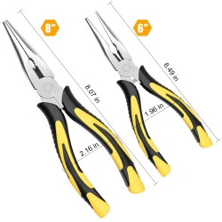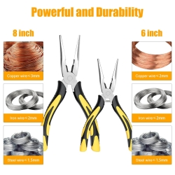 - 【High Quality Material】 The nose pliers body is made of high quality carbon steel, and the handle is made of TPR material in accordance with environmental protection standards; 6 inch needle-nose pliers force saving spring design, easy to use effortless; The nose pliers are well made, the jaws are neat, the handle is comfortable and non-slip; The blade is sharp and durable, with stronger shear force and longer service life