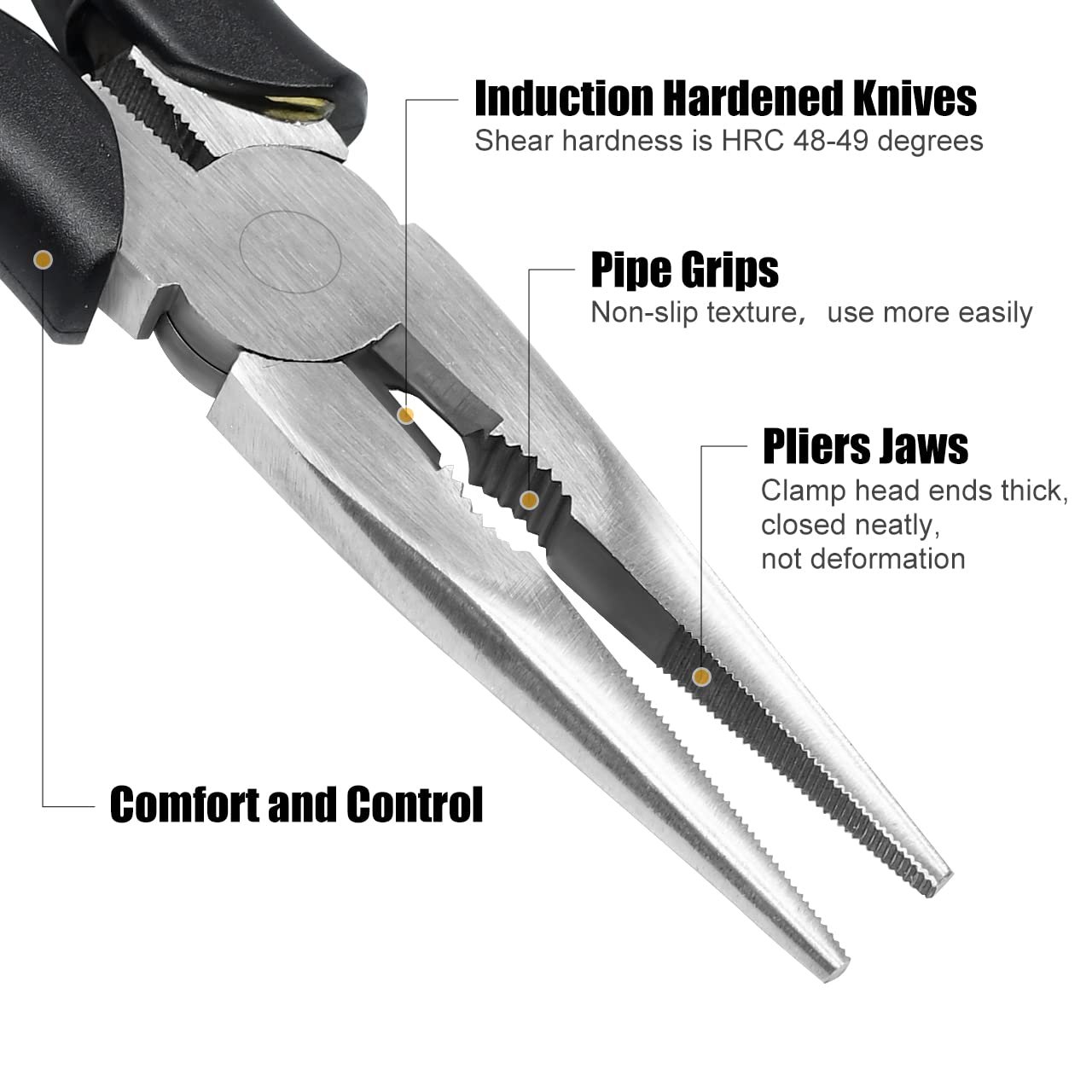 - 【Strong Cutting Force】The cutting edge hardness of HRC60-62, shear hardness of HRC48-49, can easily cut single strand; The end of the nose pliers is neat, closed well, the head of the pliers is thick, and it is not easy to misposition and deformation when using